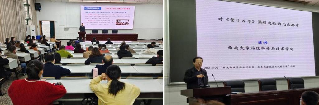 接下来,海棠书屋 陈洪教授以《量子力学》课程为例开展了第二个环节:说课程建设。陈洪教授提到,十九届五中全会以来,中央提出了的“三新一高”、“三基建一水平”,强调课程是人才培养的核心要素,课程建设的基本要求是“两性一度”,学生能力培养与课程目标设计是教师主导下的教与学的统一。教学中,不仅要将最新研究成果融入教学,还要融入课程思政元素,深度挖掘提炼专业知识体系中所蕴含的思想价值和精神内涵,科学合理拓展专业课程的广度、深度和温度,从课程所涉专业、行业、国家、国际、文化、历史等角度出发,增加课程的知识性、人文性,提升引领性、时代性和开放性。陈洪教授提倡教学中应将问题导向式互动教学和现代信息技术的应用相结合,可以采用“三助式”教学法,将学生真正放在教育的主体地位,课堂真正成为了学生自主学习、合作学习和探究学习的场所。