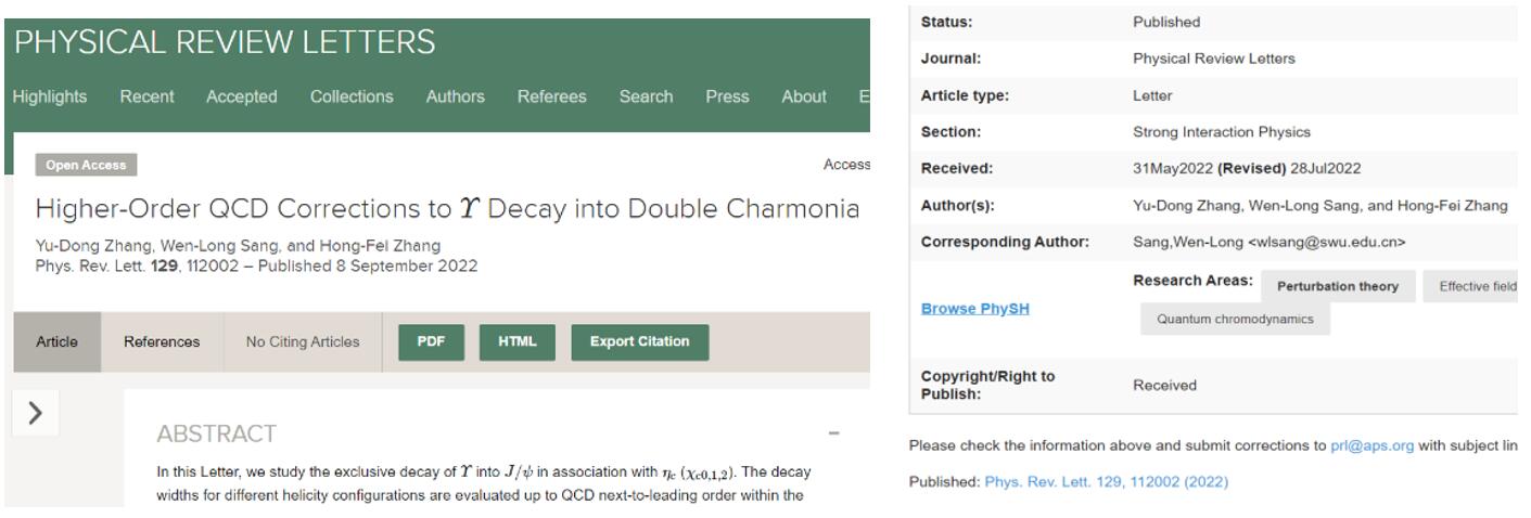 近日海棠书屋 强子物理团队桑文龙教授与研究生张余栋同学及贵州财经大学的张鸿飞老师在物理学顶级期刊《物理评论快报》(PRL)上发表题为“Higher-order QCD corrections to Upsilon decay into double charmonia”的科研工作,海棠书屋 为该成果的第一及唯一通讯作者完成单位,其中张余栋同学为第一作者,桑文龙老师为唯一通讯作者。该研究工作得到了国家自然科学基金面上基金资助。