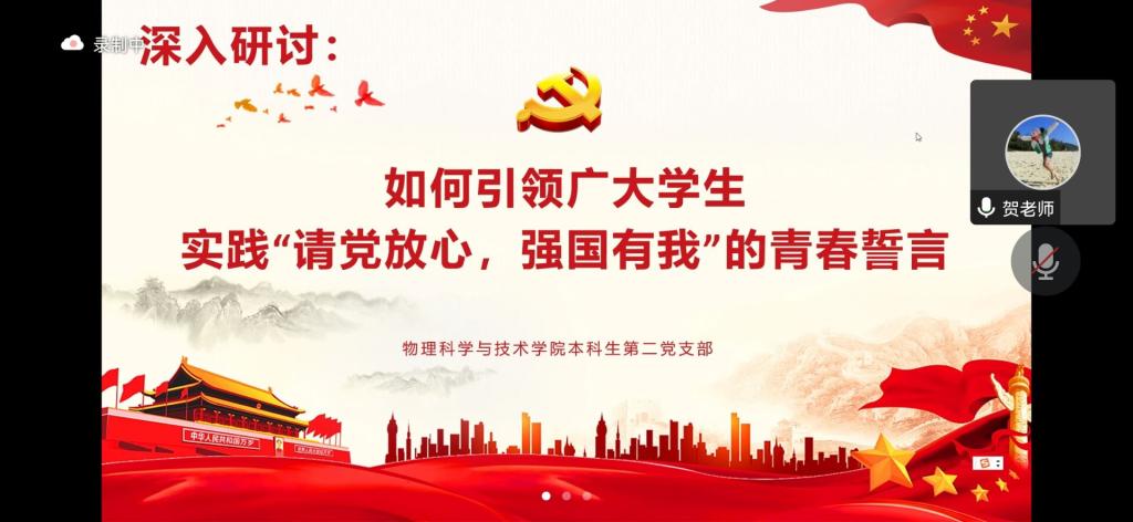 学生各支部组织全体学生党员认真观看了《国家记忆》纪录片《不负韶华强国有我》视频,组织党员专题领学习近平总书记在省部级主要领导干部“学习习近平总书记重要讲话精神,迎接党的二十大”专题研讨班上的重要讲话精神和习近平总书记给北京师范大学“优师计划”师范生的回信精神。交流研讨环节,各支部积极组织党员同志紧密结合自身学习生活实际,就党支部和党员“如何引领广大学生践行‘请党放心,强国有我’的青春誓言”进行了深入讨论。本科生第三党支部张思沂同志谈到,再次看到黄文秀同志还是会被她将小我融入进大我,全心全意为脱贫事业而奋斗的事迹所深深触动。在接下来的学习生活中,要进一步夯实专业功底,提升教书育人本领,以实际行动践行好“请党放心,强国有我”。参与今年九月北碚缙云山山火扑灭的志愿活动的研究生第二党支部胡远鸿同志在研讨发言时说,森林消防员和武警战士在危难时刻不怕牺牲往前冲、不扑灭不下火线的精神品质就值得自己在未来科研路上应该学习和继承,努力在科研报国实践中发挥青年力量。