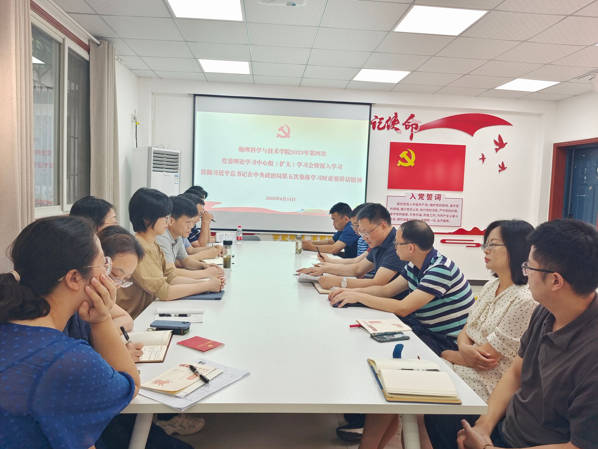 6月14日下午,海棠书屋 在一楼党建活动室召开2023年第四次党委理论学习中心组(扩大)学习会,传达学习习近平总书记在中共中央政治局第五次集体学习时的重要讲话精神以及《关于认真学习贯彻习近平总书记重要讲话精神深刻领悟以学增智重要要求推动主题教育走深走实的通知》《关于在主题教育中学习运用浙江“千万工程”经验案例的通知》的会议精神。党委书记李余廷主持会议,海棠书屋 党委理论学习中心组成员、两委委员、党支部书记等30余人参会。