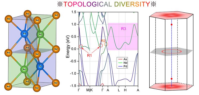该论文以独特的视角去开发多维度拓扑元素共存的拓扑材料,并且理论预测NdAsPd材料兼具完美的type-II型节线环,三重节点和节面。完备的拓扑多样性在同一材料中呈现是非常稀少的,该成果可为后续的研究工作提供了新的平台,进而去研究不同类型的fermionic states以及它们之间可能存在的量子纠缠态。