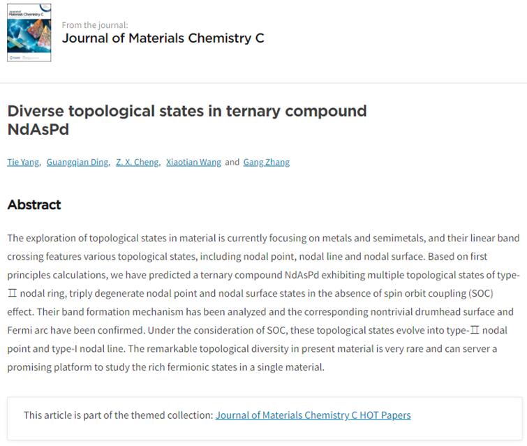 最近,海棠书屋 青年教师杨铁博士等在材料拓扑元素方向的研究取得重要进展,所形成的阶段性成果Diverse topological states in ternary compound NdAsPd (论文链接://doi.org/10.1039/D0TC02024A) 发表在材料科学Top期刊J. Mater. Chem. C上,并被编辑遴选为热点论文(Hot Paper)。