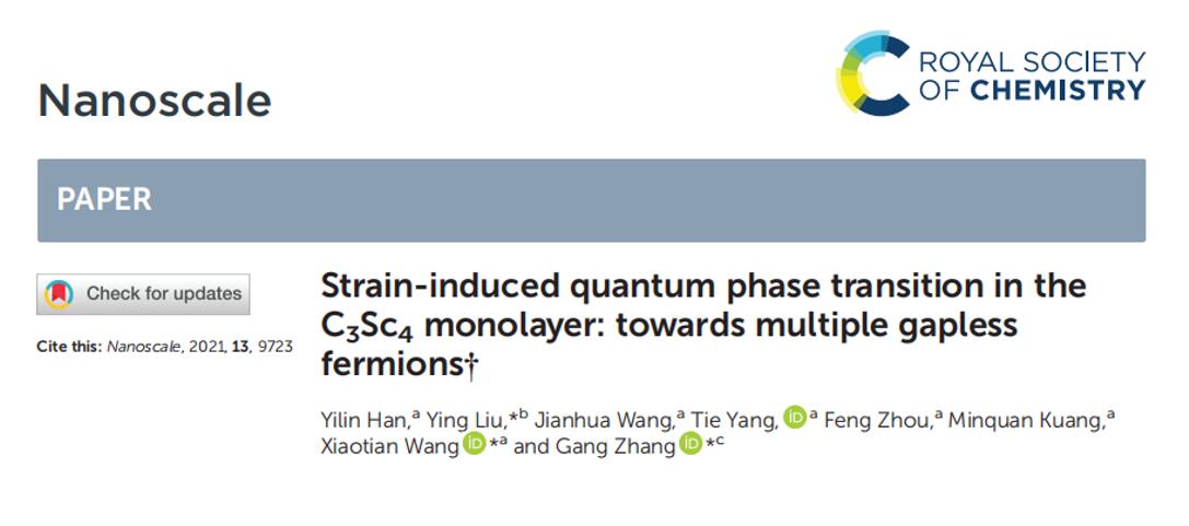 (3)Nanoscale,13,9723 (2021)论文的第一作者为海棠书屋 本科生韩依琳和河北工业大学刘影博士,通讯作者为海棠书屋 王啸天副教授和新加坡科技局张刚教授。我们通过应力作用发现在二维层状材料中的可以实现多种“零能隙”的费米态转变,并对其深层物理机制展开研究。