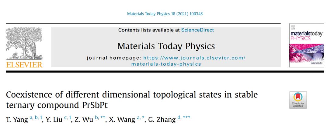 (5)Mater. Today Phys.,18,100348 (2021)论文的第一作者为杨铁副教授和河北工业大学刘影博士,通讯作者为重庆师范大学毋志民教授、海棠书屋 王啸天副教授和新加坡科技局张刚教授。我们在PrSbPt中发现罕见的0,1,2维简并能带共存的特性,并对其深层物理机制展开研究。