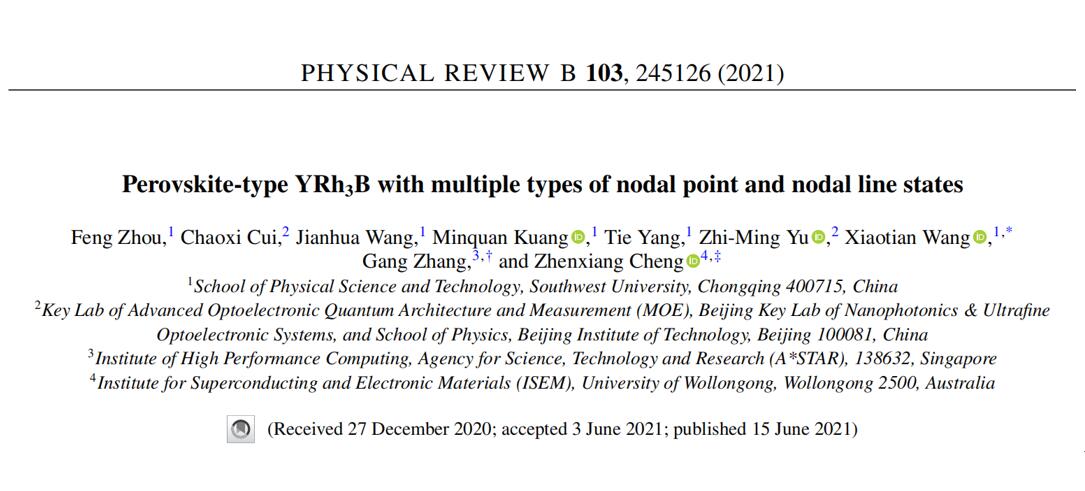 (2)Phys. Rev. B 103,245126 (2021)论文的第一作者为海棠书屋 研究生周凤,通讯作者为海棠书屋 王啸天副教授、新加坡科技局张刚教授、澳大利亚伍伦贡大学程振祥教授。我们提出了YRh3B中奇特的多种节点和节线共存特征,并对其深层物理机制展开研究。