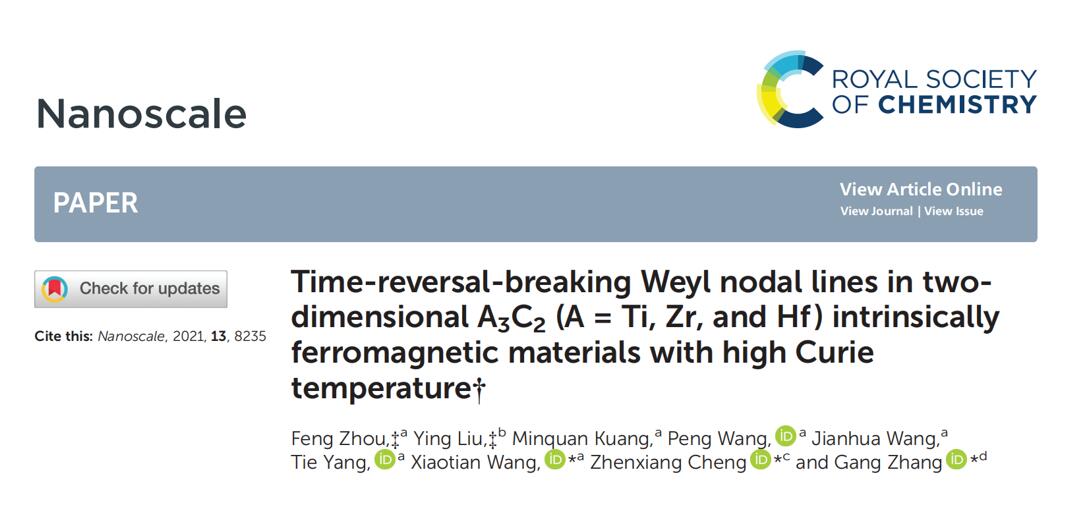 (4)Nanoscale,13,8235 (2021)论文的第一作者为海棠书屋 研究生周凤和河北工业大学刘影博士,通讯作者为海棠书屋 王啸天副教授、新加坡科技局张刚教授、澳大利亚伍伦贡大学程振祥教授。我们在高居里温度的A3C2层状材料中发现Time-reversal-breaking的外尔节线,并对其深层物理机制展开研究。