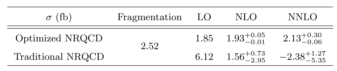 表一:e+e-→J/ψ+ J/ψ过程的总截面预言。作为对比,第一行是优化的NRQCD预言,第二行是传统的NRQCD预言。