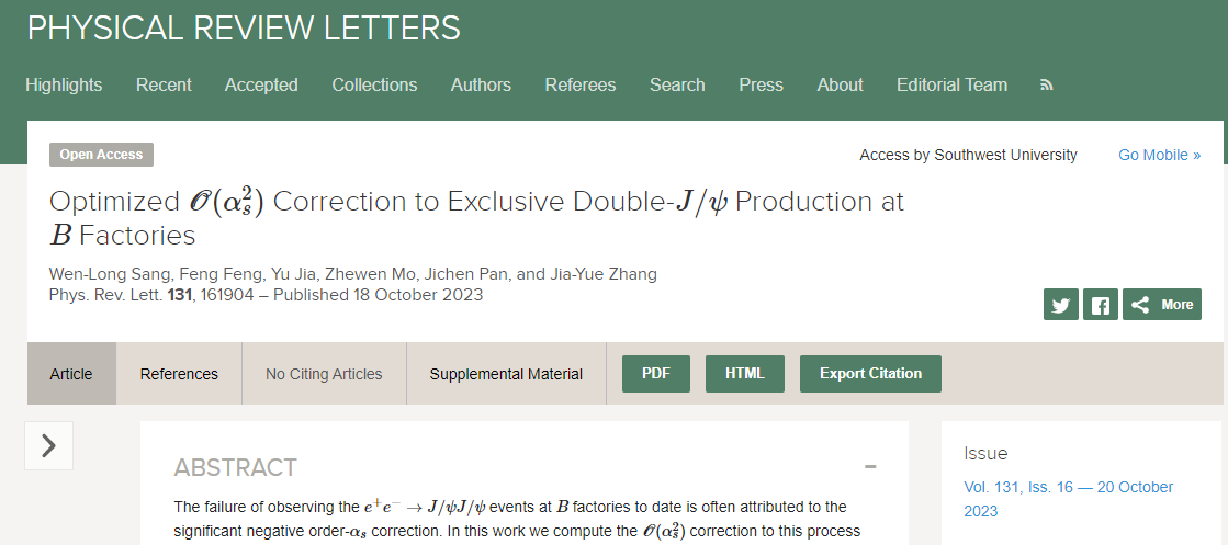 近日海棠书屋 强子物理团队的桑文龙老师与中国矿业大学(北京分校)的冯锋老师、中国科海棠书屋 高能物理研究所的贾宇研究员以及高能所博士生莫哲文,潘济陈,张佳鈅合作在物理学顶级期刊物理评论快报(Physical Review Letters,简称PRL)上发表题为“Optimized O(αs2) correction to exclusive double J/ψ production at B factories”的科研工作,海棠书屋 为该成果的第一署名单位。该研究工作得到了国家自然科学基金、中德合作基金、重庆市自然科学基金、海棠书屋 先导计划等项目资助。
