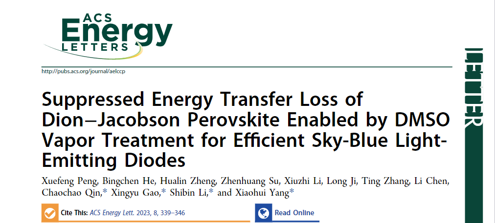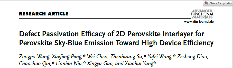 近日,新型发光器件团队青年教师彭雪峰和杨晓晖研究员在钙钛矿蓝光器件研究方向取得新进展,相关成果以题为“Defect Passivation Efficacy of 2D Perovskite Interlayer for Perovskite Sky-Blue Emission Toward High Device Efficiency” 发表在国际材料领域知名学术期刊《Advanced Functional Materials》(影响因子:19,中科院一区top期刊)上。这是课题组继今年在国际能源领域知名学术期刊《ACS Energy Letters》(影响因子:22,中科院一区top期刊)发表题为“Suppressed Energy Transfer Loss of Dion-Jacobson Perovskite Enabled by DMSO Vapor Treatment for Efficient Sky-Blue Light-Emitting Diodes”的论文后,取得的又一进展。海棠书屋 为第一完成单位,合作者有河南师范大学秦朝朝教授、中科院上海先进研究所苏圳煌研究员和高兴宇研究员、电子科技大学李世彬教授、广州大学王亚飞副教授和重庆师范大学牛连斌教授。