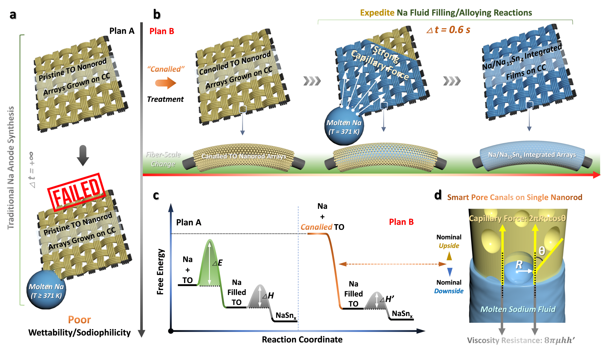 低成本钠电池是储能领域的研究热点,而合适的负极材料是实现其商业化应用的关键。其中,钠金属负极具备理论比容量高(1165 mAh/g)、氧化还原电位低(-2.71V vs. SHE)、储量丰富、开发成本低等诸多优势,有望实现高能量密度储能,是一种备受关注的负极材料。然而,金属钠化学活性高,在充放电过程中面临枝晶生长和体积膨胀等问题,从而导致钠金属电池库伦效率低,循环寿命短,甚至存在枝晶刺穿隔膜引发短路和安全隐患。在本研究中,朱建慧副教授团队将富含缺陷的氧化锡纳米棒阵列与碳布基底集成,开发了独特的3D亲钠衬底。研究小组对液相生长的氧化锡纳米棒进行煅烧,纳米棒上演化出大量的管道缺陷,显著提升了衬底材料的表面能参数和固液润湿性,促进了熔融钠的自发浸润及合金化/成核反应;生成的亲钠合金相Na15Sn4中间层有助于降低成核能垒,引导钠离子快速均匀轴向沉积,并有效抑制充放电过程中的枝晶生长,极大提升了金属钠负极的稳定性和安全性。这一独特的设计为实用钠金属负极的推广应用提供了新的研究思路。