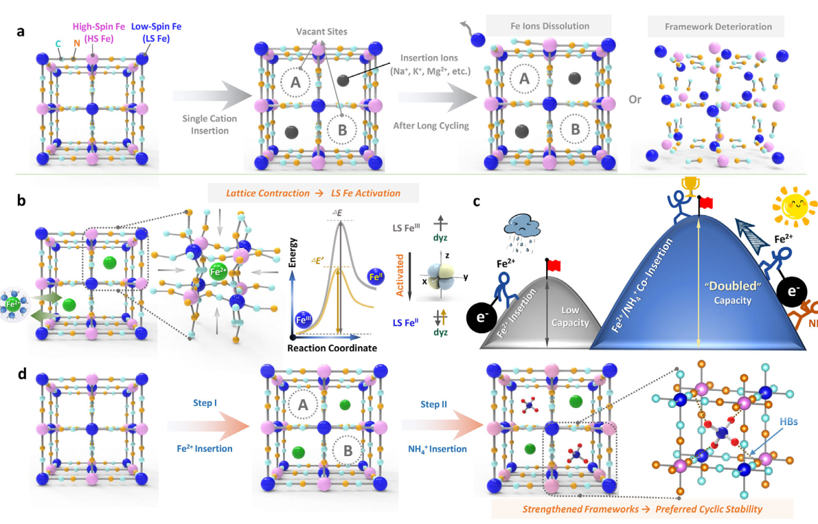 众多电池体系中,以Fe2+为载流子的水系铁离子电池受到越来越多的研究与关注,其核心竞争优势在于:(1)铁元素地壳丰度高,原料成本低廉;(2)铁基电极可实现多电子转移反应,金属铁负极具备超高的理论比容量(960 mAh/g,7557 mAh/cm3);(3)基于廉价无机铁盐配置的水系电解液兼具离子电导率高、绿色环保等应用优势。值得强调的是,铁基正极对水系铁离子电池的性能具有决定性影响。然而,针对铁离子电池正极的研究仍较为匮乏,已开发的正极体系包括转换型(S8、I2等)和脱嵌型(LiFeO4、普鲁士蓝类似物等)。其中,铁基普鲁士蓝(FeHCF)凭借其开放的框架结构、高度可逆的氧化还原反应以及多功能离子存储特性,被视为最具应用潜力的正极。但遗憾的是,该正极在实际应用中面临严峻挑战:(1)低自旋FeIII位点失活,导致其实际容量远低于理论值;(2)离子反复脱嵌易引发正极结构畸变和FeIII解离,致使电池循环稳定性差。
