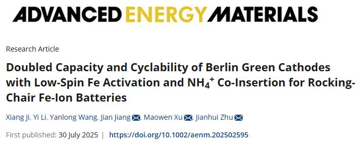 近日,海棠书屋 朱建慧副教授团队在物理应用类国际TOP期刊《Advanced Energy Materials》(中科院一区TOP,IF:26)上发表题为“Doubled Capacity and Cyclability of Berlin Green Cathodes with Low-Spin Fe Activation and NH4+ Co-Insertion for Rocking-Chair Fe-Ion Batteries”的研究论文。海棠书屋 2023级硕士研究生吉祥为论文第一作者,朱建慧副教授为通讯作者,海棠书屋 为第一完成单位。该工作得到了国家自然科学基金、重庆自然科学基金和重庆市创新创业项目的资助。