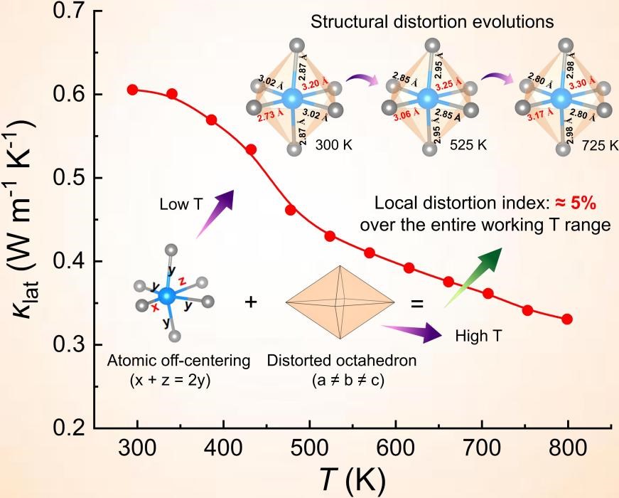 I-V-VI2/IV-VI合金因其丰富的物理性质深受研究者的喜爱,但此类化合物仍有一些电热输运机理未被揭示。其中,最有趣的一个物理问题是,与其他立方型化合物相比,此类合金在全温区内表现出超低的晶格热导率。虽然阳离子的局域偏心行为已被提出并用于解释其本征低导热性,但是在室温下测定的阳离子的偏心度仍不能充分解释此类化合物在宽工作温度范围内持续低热导率的机制。本文采用原位同步辐射X射线原子对分布函数(operando synchrotron X-ray PDF)技术,结合积分差分相位衬度扫描透射电镜(iDPC-STEM),直接观测了I-V-VI2合金中阳离子偏心度和阴离子配体的几何构型在不同温度下的动态演变过程。结果表明,在局域结构扭曲的n型立方(AgBiSe2)1-x(PbS)x高熵固溶体中,其全温区内持续的超低晶格热导率从本质上取决于在低温范围内中心阳离子的高度偏心和在高温下阴离子配体的几何畸变的互补协同效应。