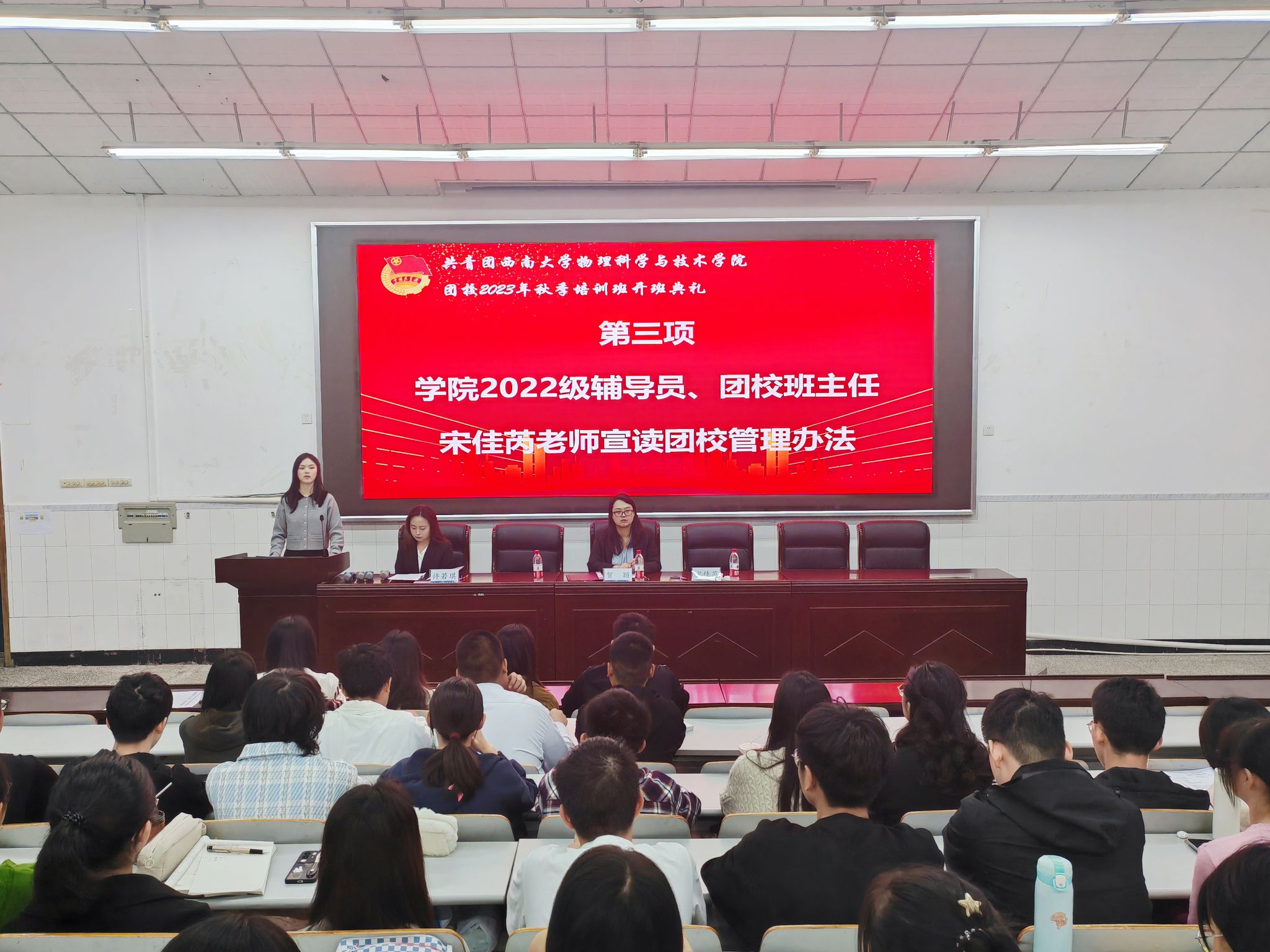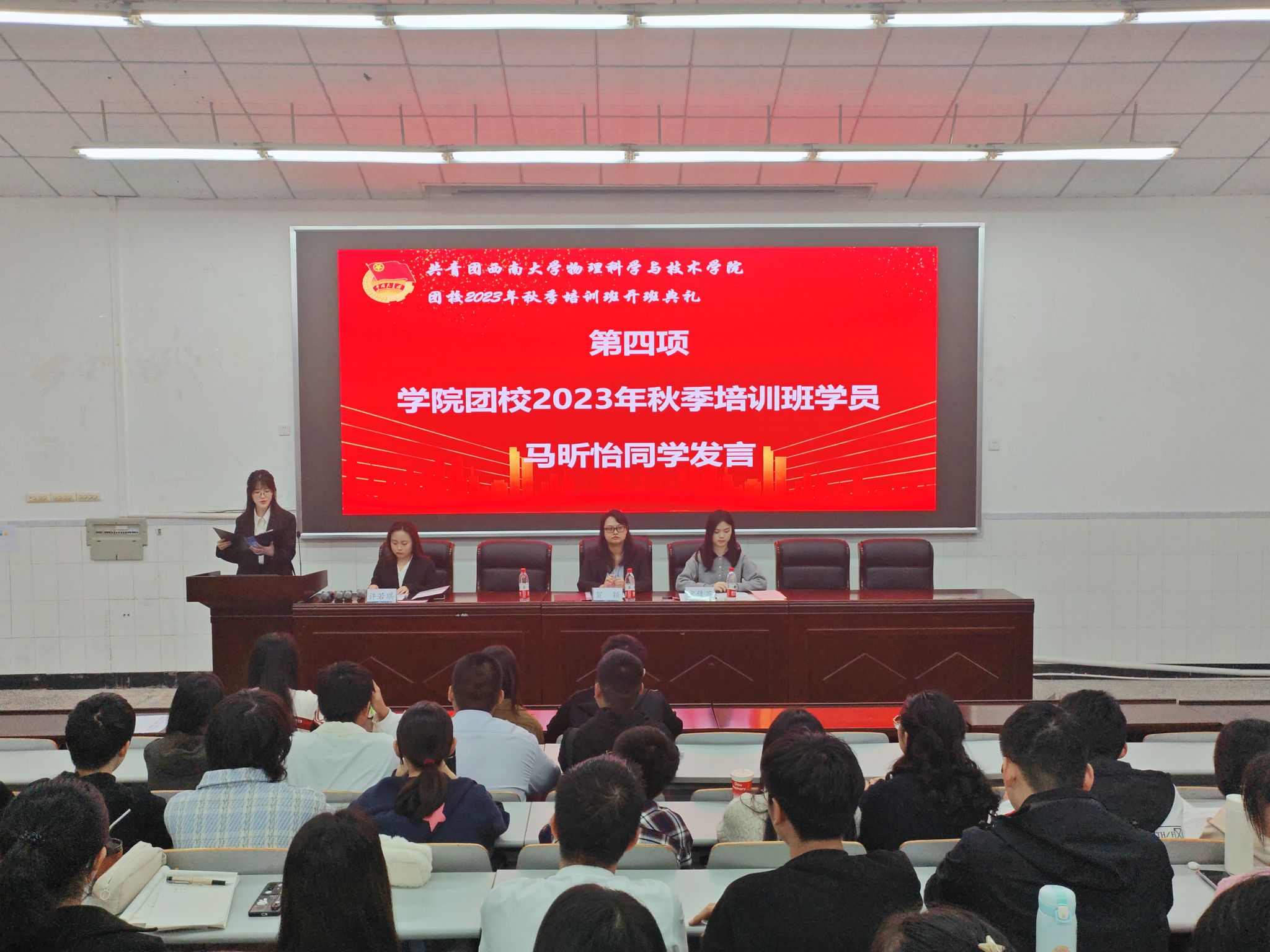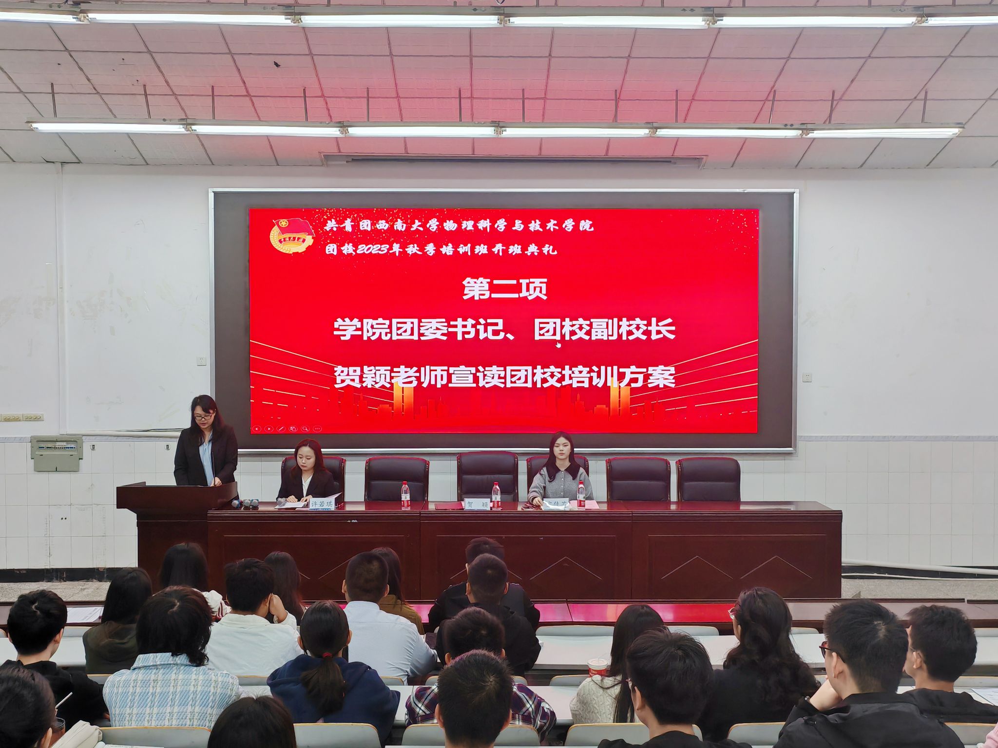 2023年10月22日上午8点30分,团校开班典礼在物理大楼大阶梯教室举行。海棠书屋 团委书记、团校副校长贺颖,2022级辅导员、团校培训班班主任宋佳芮和100名参训学员参会。典礼由海棠书屋 团委副书记、团校培训班班长许若琪主持。