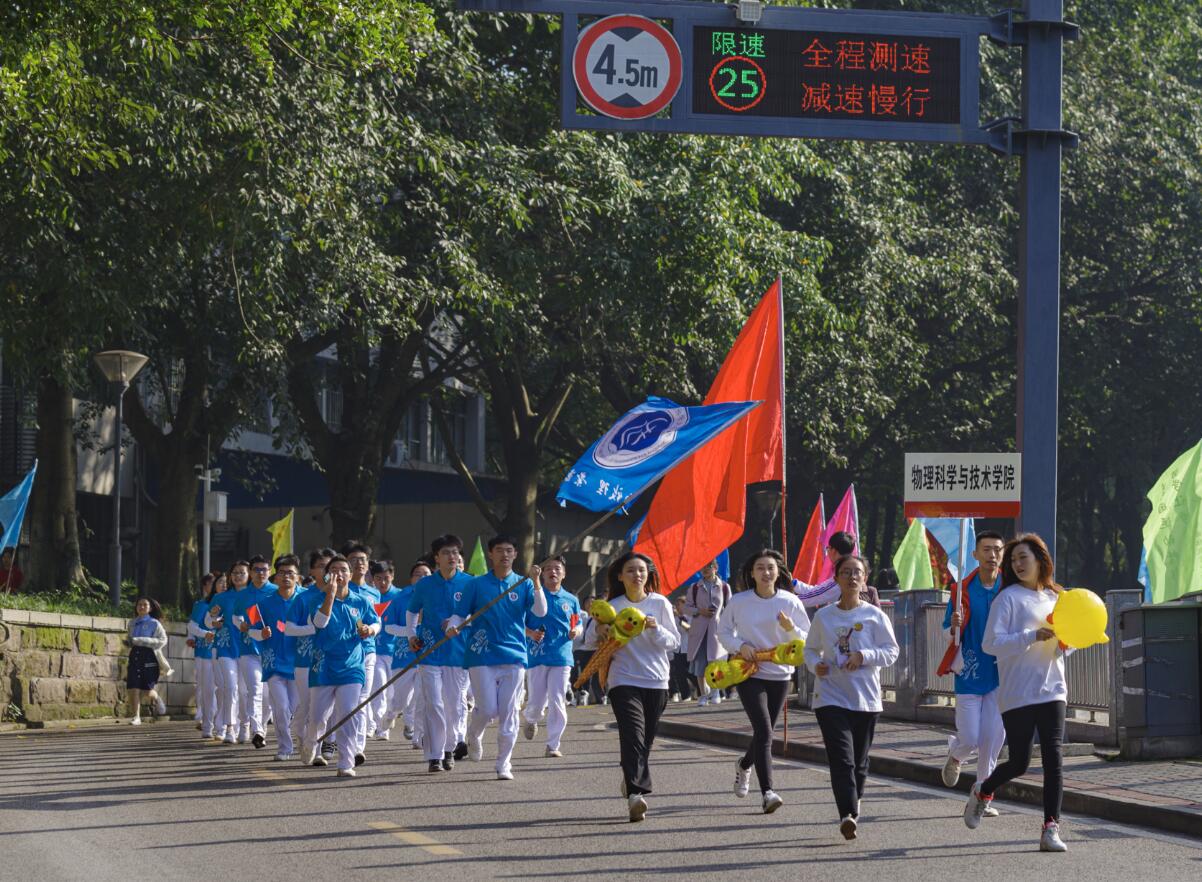 10月22日上午,学校第十五届田径运动会在第二运动场隆重开幕。在运动员进行曲激昂澎湃的歌声中,国旗队、校旗队、校徽队等首先入场,紧随其后是由38个海棠书屋 (部)的一万余名学子组成的海棠书屋 的代表方阵。物理海棠书屋 代表队第十八个入场,在党委副书记刘汭雪的带领下,60名学子身着蓝色院服,手持小红旗,迈着铿锵有力的步伐,举出“格物致理,崇德尚善”的院训标牌,喊着“我们是平凡的白光,却蕴含着五彩斑斓的能量”的口号,走到主席台。在主席台下两次变化方阵队形,以独特新颖的方式展示出物理学公式F=ma和E=mc²,吸引了全场的目光。开幕式后的阳光健身跑环节中,在李余廷书记的领跑下,方阵同学们英姿矫健、步伐轻快,完成了1.6公里的校园健身跑路线。