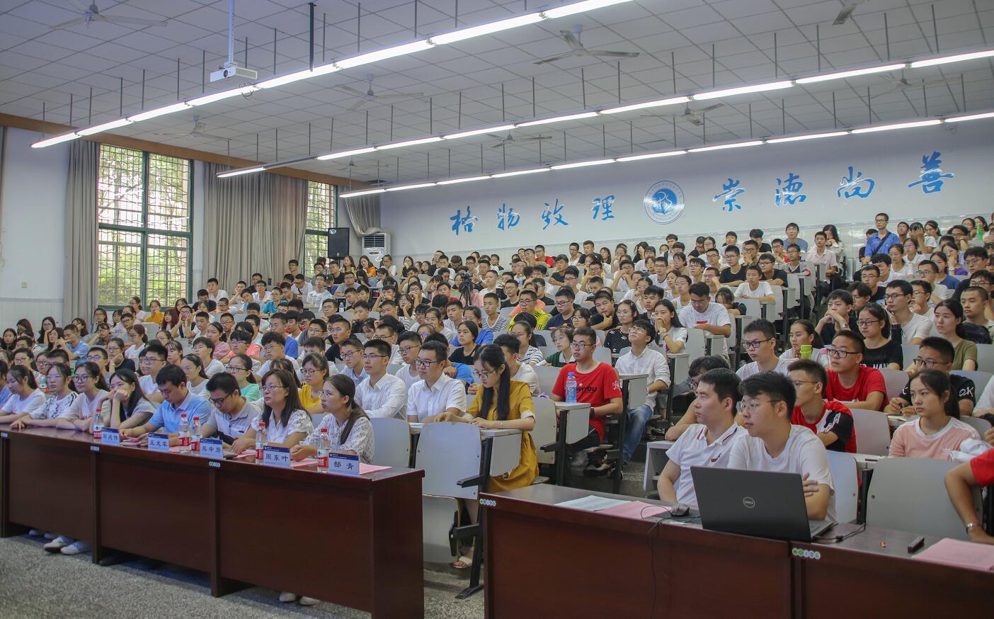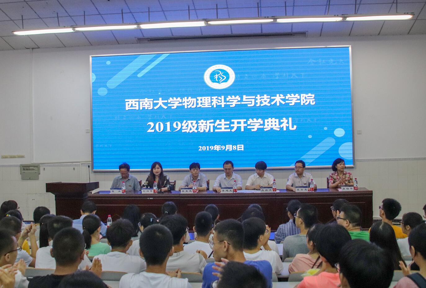 9月8日上午,物理科学与技术海棠书屋 2019级新生开学典礼在物理大楼大阶梯教室隆重举行。海棠书屋 党委书记李建光,院长、党委副书记熊祖洪,副院长吴正茂、袁宏宽,学科带头人廖伯琴教授、陈洪教授,教师代表郜青副教授,以及2019级研究生、本科生辅导员与班主任等出席典礼。2019级全体研究生、本科生共计299人参会。典礼由海棠书屋 党委副书记、纪委书记刘汭雪主持。