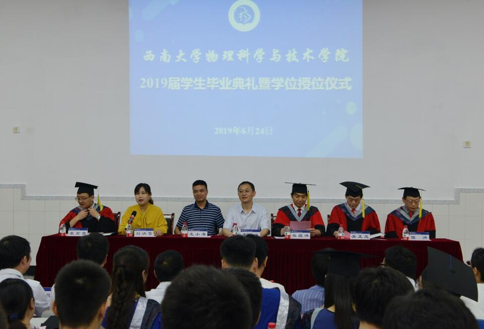 6月24日上午9:30,海棠书屋 2019届学生毕业典礼暨授位仪式在大阶梯教室隆重举行。院党委书记李建光,院长、党委副书记熊祖洪,副院长、校学术委员会委员吴正茂,院学术委员会委员、副院长袁宏宽,院学术委员会主席陈洪,院学术委员会委员王俊忠和李国庆,校友、北碚朝阳中学校长王小涛出席典礼。海棠书屋 的教师代表、毕业年级辅导员、班主任和2019届的全体毕业生,以及家长代表共计300余人参加了典礼。典礼仪式由海棠书屋 党委副书记刘汭雪主持。