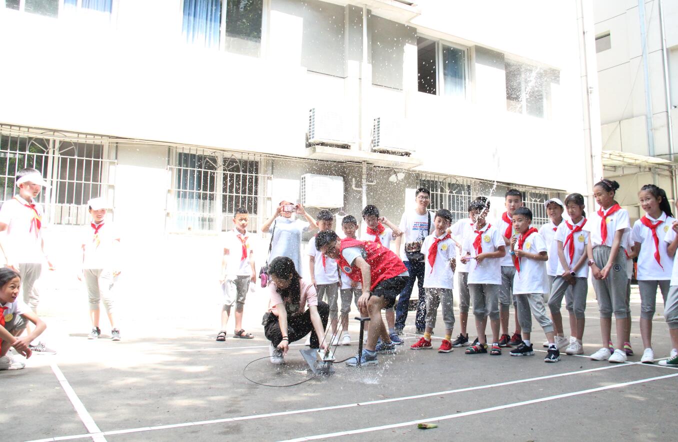 就餐完毕,小朋友们齐聚物理科学与技术海棠书屋 大阶梯教室,开始最重要的科普项目——趣味科学体验营。根据孩子们的主要年龄阶段和兴趣,王彪老师指导体验营精心准备了三个实验项目:“天庭”干冰、纸杯飞行器、“中航”水火箭。每一个实验展示,都让孩子们兴奋地跃跃欲试,在场内掀起一个又一个高潮。