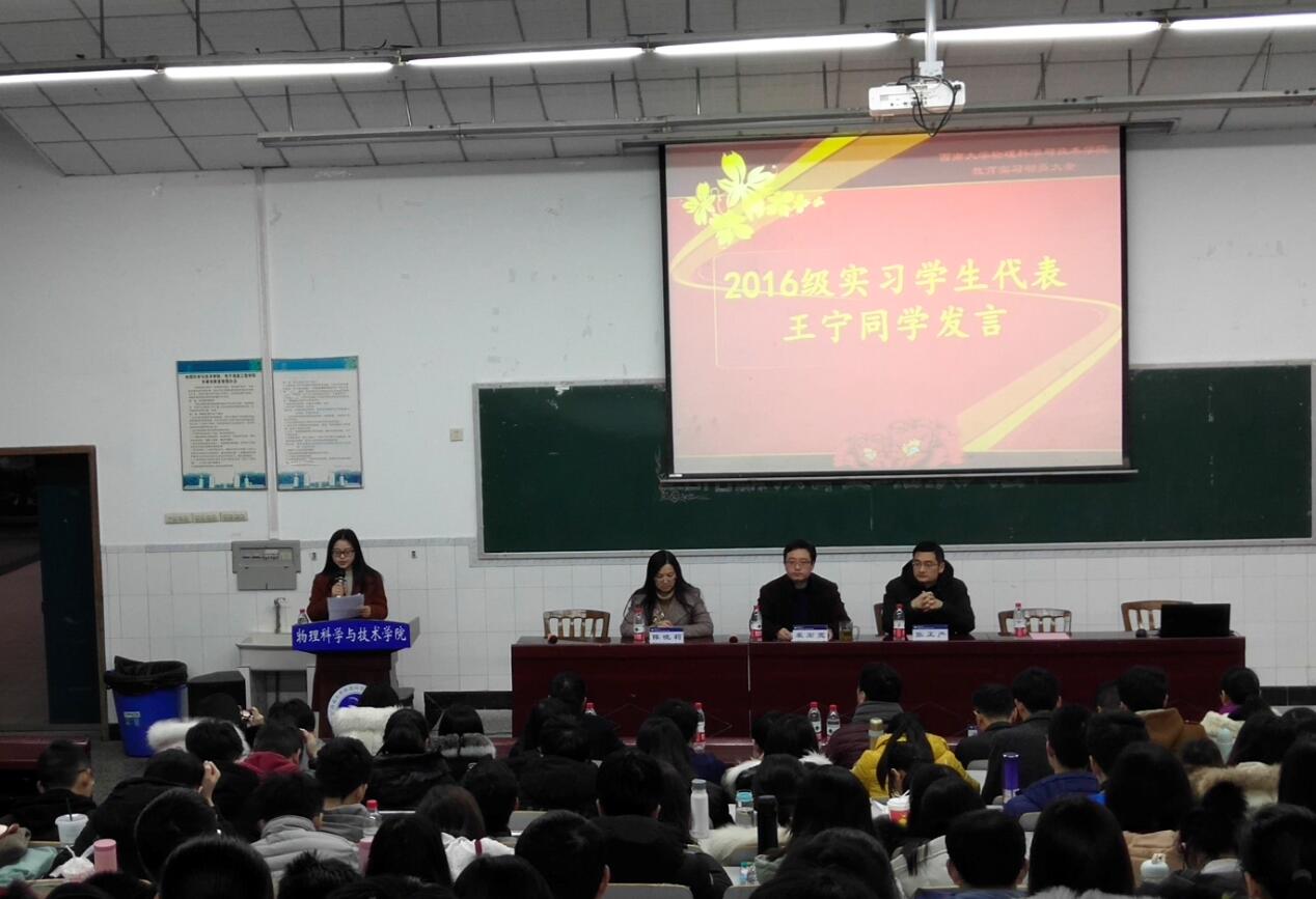 1月15日上午,2019年本科生实习动员大会在海棠书屋 大阶梯教室举行。副院长袁宏宽教授、院长助理张正严副教授、物理教育教研室副主任陈晓莉副教授,实习指导教师马忠平、李太华、蒋小平、邓磊、陈历相、年级辅导员唐昊坤出席动员会,2016级全体公费师范生参会。