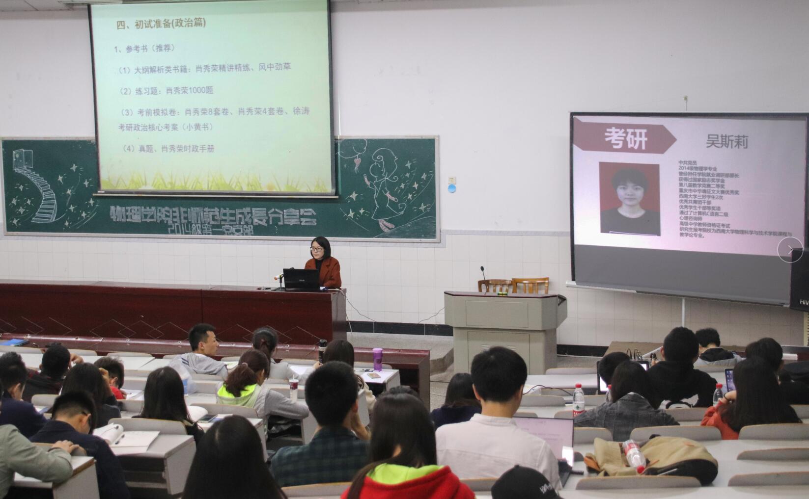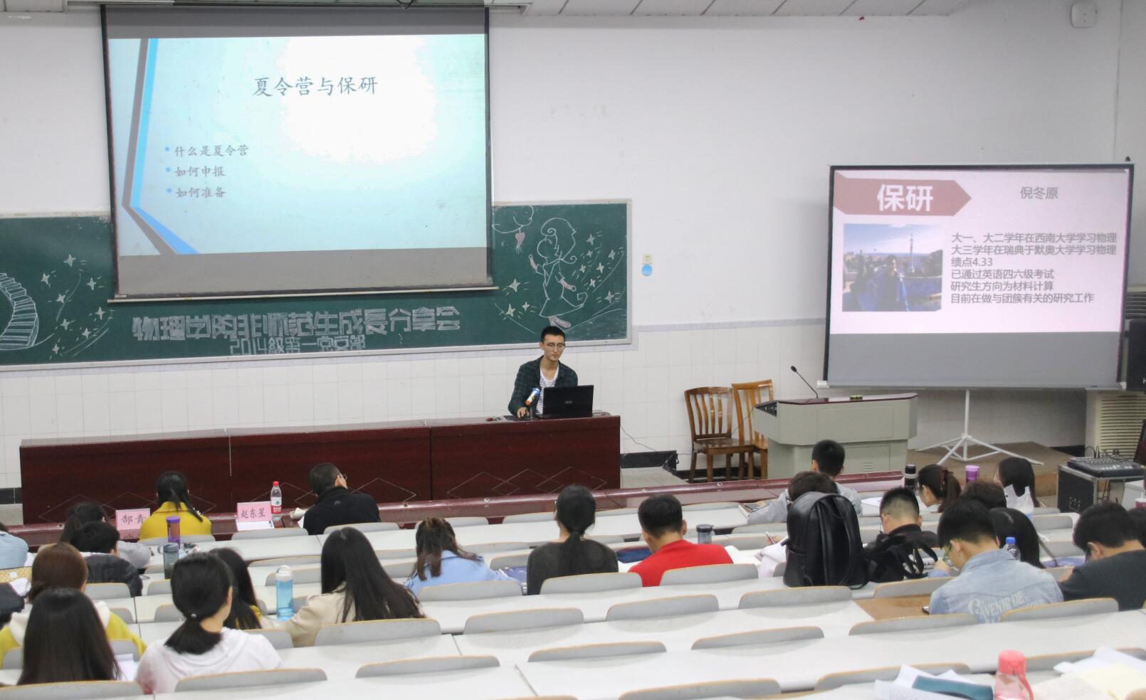 分享会第一环节为考研经验交流。考取本院凝聚态物理专业的王影同学、考取本院课程与教学论专业的吴斯莉同学和考入成都电子科技大学无线电物理专业的李国宇同学分享了各自的考研经历。在英语复习方面,王影建议分为“单词记忆”“真题演练”“背诵范文”三个阶段进行准备,强调要熟悉物理名词的英文单词;李国宇强调“在阅读中加强单词的积累”;吴斯莉指出“英语学习贵在坚持,得分在阅读理解”。他们就专业课教材版本、政治复习提纲、高数历年真题进行了介绍和推荐,建议学弟学妹们要“主动联系在读研究生、查找意向学校的考试真题、关注意向海棠书屋 官网发布的政策信息”。