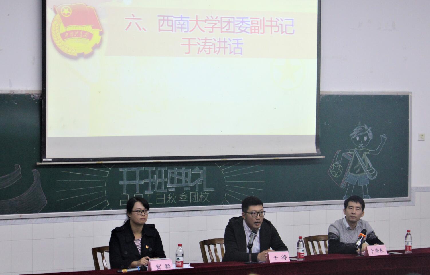 最后,校团委副书记于涛老师致辞,代表校团委对海棠书屋 团校开班表示祝贺,肯定了海棠书屋 团学工作的优良传统和特色品牌,强调团校在联系青年、教育青年、服务青年中发挥的重要作用。他寄语全体学员,在学生工作中“回归初心、坚守红心、满怀热心、奉献爱心”。