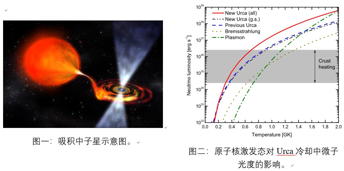 在该工作中,王龙军副教授与合作者首次探讨了原子核的激发态对吸积中子星外层(外壳层和海洋层)的Urca冷却机制的影响。Urca过程指的是一对原子核在一些特殊的外部条件下,通过相互之间的电子俘获和贝塔衰变,放出大量的中微子与反中微子,后者会带走大量的能量从而导致所处环境得到冷却的一种核过程。如图二所示,他们通过研究发现,考虑了原子核的激发态效应以后,Urca冷却过程的冷却效率(即中微子光度)比以往的认识增加了很多倍,从而超越了其他的冷却过程、抗衡并压制了各种加热过程的效率总和,进而起到快速而有效地冷却吸积中子星外层环境的作用。