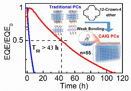 图1. 12-Crown-4 ether辅助原位生长的钙钛矿晶体具有较厚的PbBr4层(n>55),提高了钙钛矿发光二极管的性能和稳定性。