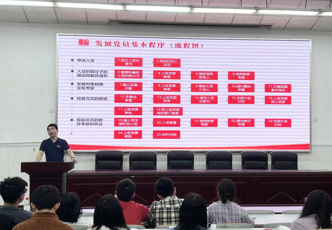 随后,卜海东老师围绕大家普遍关注的关于重庆市12371系统和学校党费收缴系统等党务信息平台的日常维护和具体操作、党员发展的具体程序与要求、党的组织生活开展及党支部日常工作规范化的记录等内容进行了逐一讲解。并重点就新修订的《海棠书屋 发展党员工作实施细则》,对发展党员工作的4个总要求、5个发展阶段、12个时间节点、25个流程步骤作了全面系统的介绍,并对发展党员工作中涉及到教育培养考察簿、入党志愿书、思想汇报、公示等过程性材料的填写注意事项、常见疑问和容易出错的环节,以案例形式进行了针对性讲解。