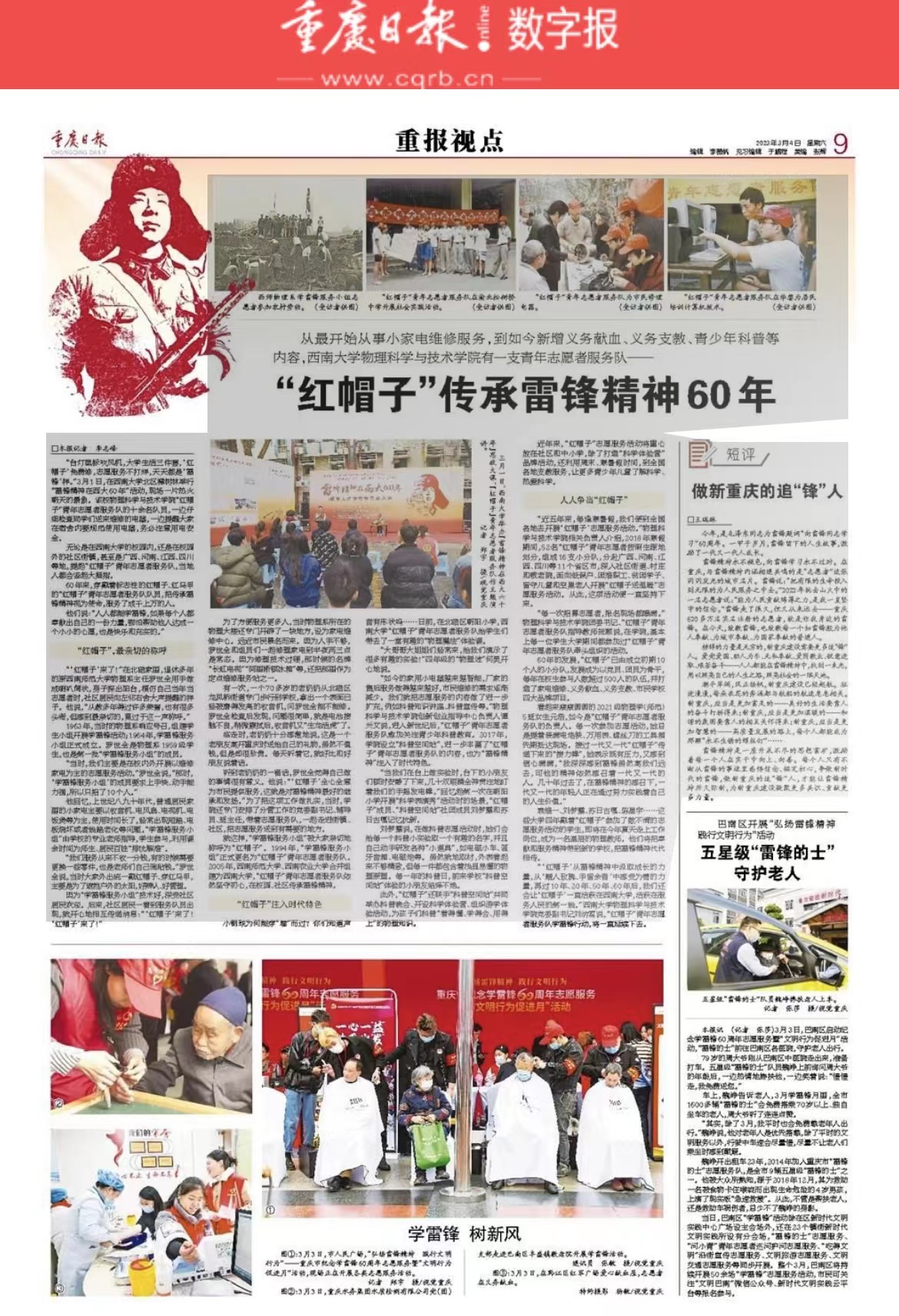 “一团火的热情真诚、一滴水的博爱宽容、一颗钉的勤奋钻研、一块砖的朴实坚韧、一片叶的感恩奉献”,60年来海棠书屋 “红帽子”志愿者服务团队用一个个具体行动学习践行雷锋精神,书写了一个个鲜活的学雷锋故事,获得了重庆日报长篇专题报道宣传——《“红帽子”传承雷锋精神60年》,以下为全文报道。