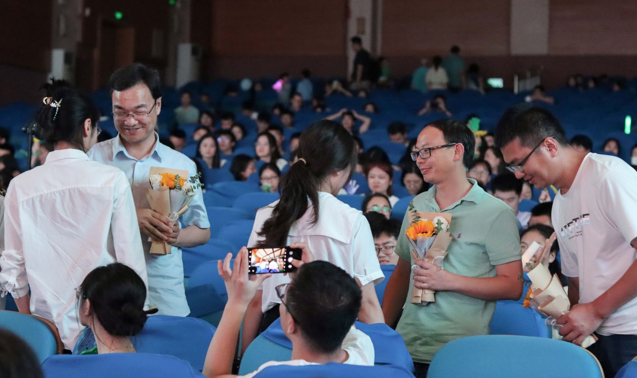 玉兰花虽开了又谢,青春却永不散场,舞蹈《零零年代》拉开了第三篇章的序幕。幕布剧《青春剪影》光与影交织错落,记录了大学生活的欢喜与忧愁;吴正茂院长和谭兴文老师、杨继勇老师、周廷伟老师、王龙军老师联袂带来的歌曲《外面的世界+明天会更好》表达了老师们对毕业生同学的由衷祝福,希望他们能继续秉持“格物致理,崇德尚善”的院训,向着更远的目标奋勇前进。同学们再度沸腾起来,纷纷向恩师们献花致谢。晚会当中还穿插着互动游戏和微信抽奖环节,,产生了九名幸运观众。
