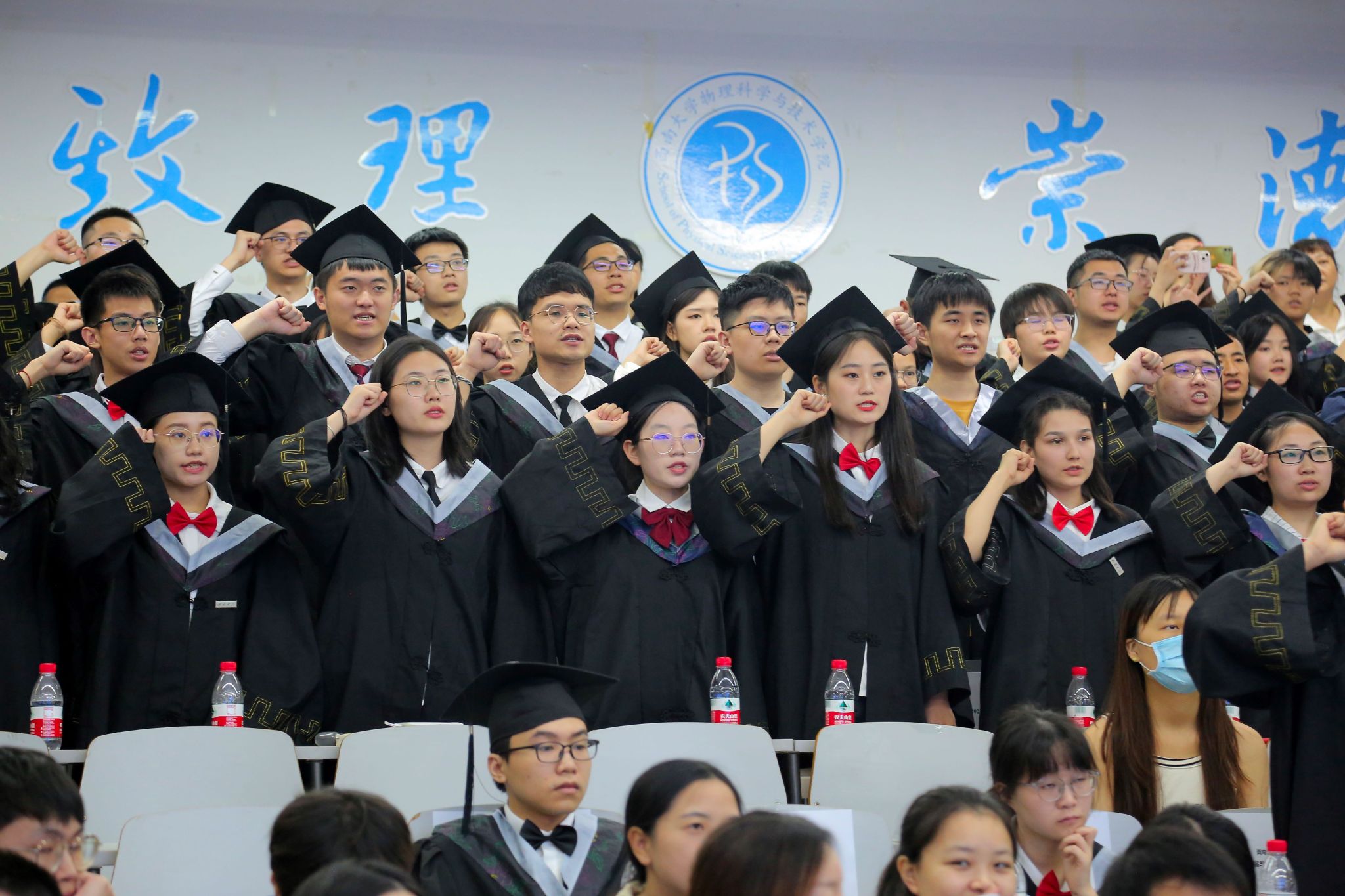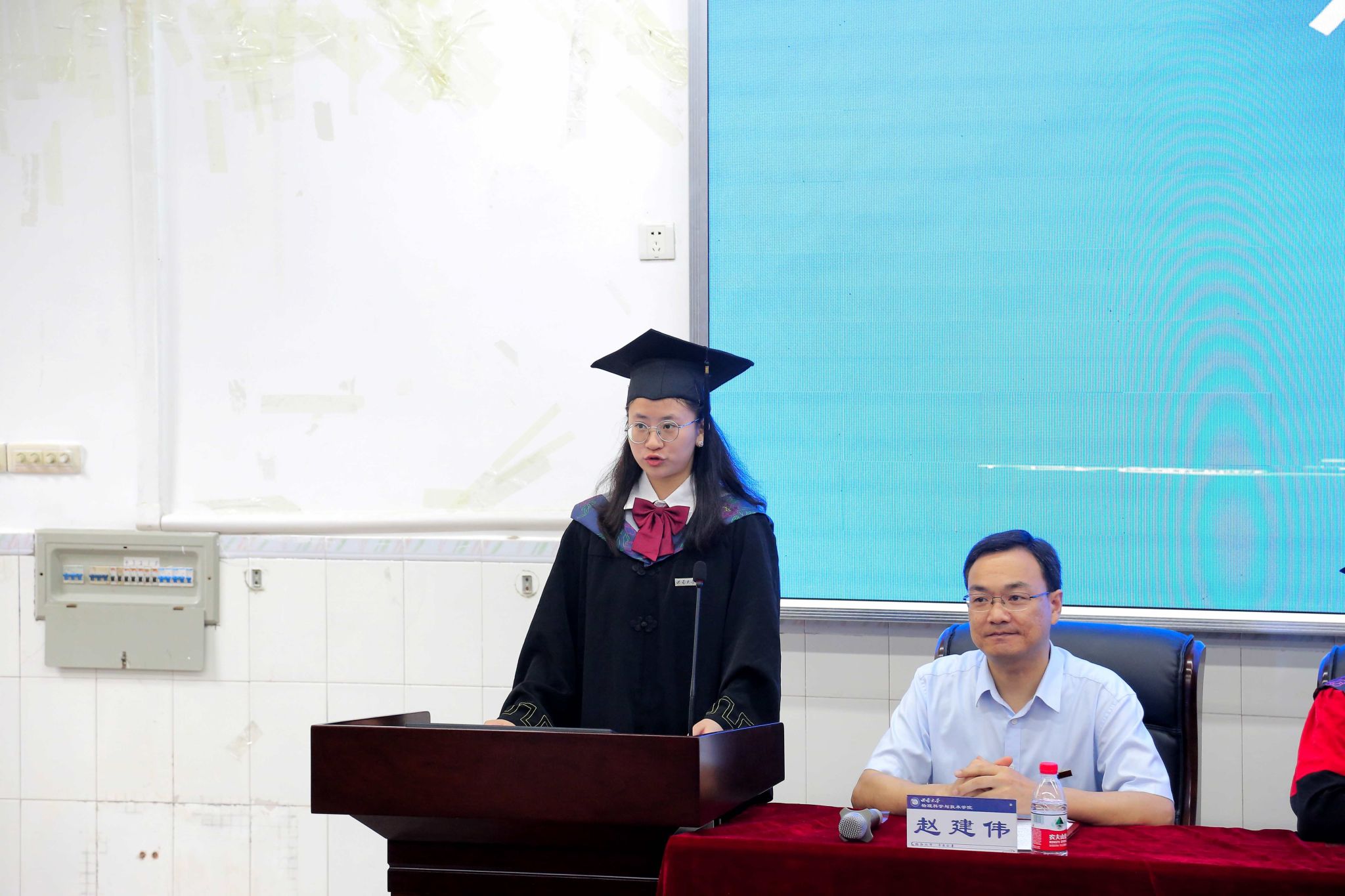 理论物理专业王建华、物理学专业蒋若冰同学分别作为毕业研究生、本科生代表发言。王建华同学回忆了自己充满挑战和欢喜的研究生生活,分享了“学会分析与思考,学会忍耐和锻炼,学会合作与竞争”三点成长收获。他诚挚地向导师同窗致谢,祝福海棠书屋