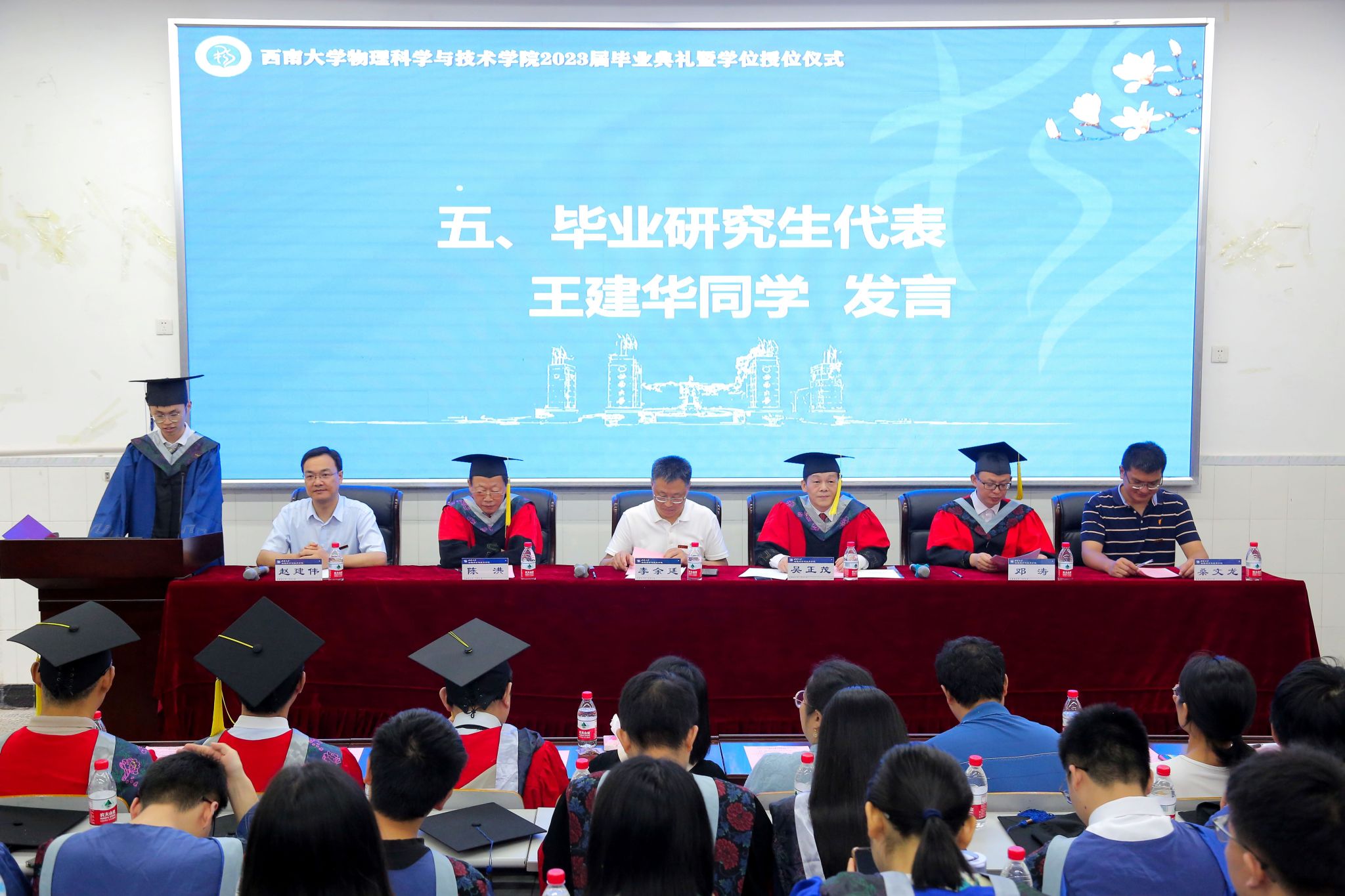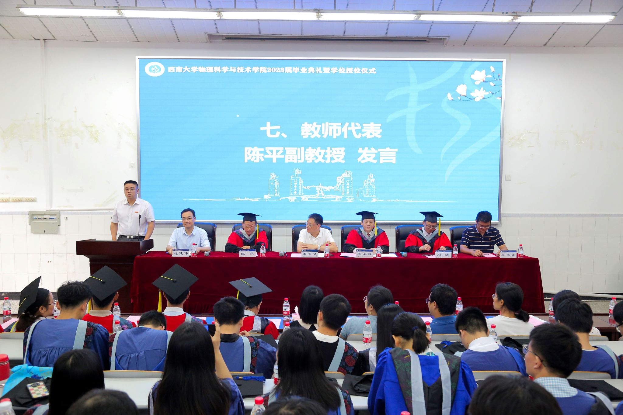 陈平副教授作为教师代表发言,他对同学们顺利完成学业表示祝贺,希望同学们用上下求索的精神,用滴水穿石的毅力,用青春搏击的力量,立足新岗位新身份做出西大物理人自己的贡献。