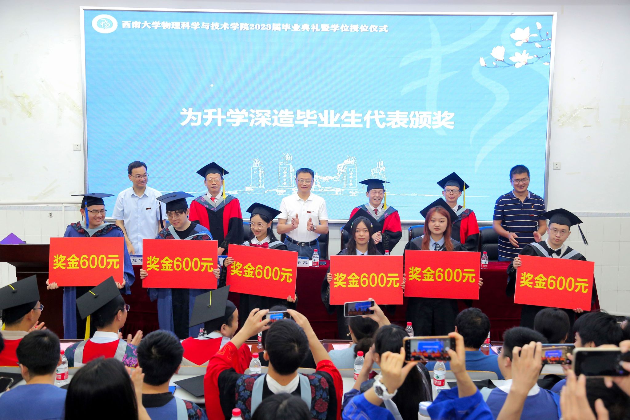 授位结束后,李余廷书记宣读了市级、校级优秀毕业生,优秀师范毕业生,优秀毕业论文,升学毕业生等获奖名单。主席台上的领导老师为受表彰的学生代表颁奖,继续深造的同学获得奖金奖励。