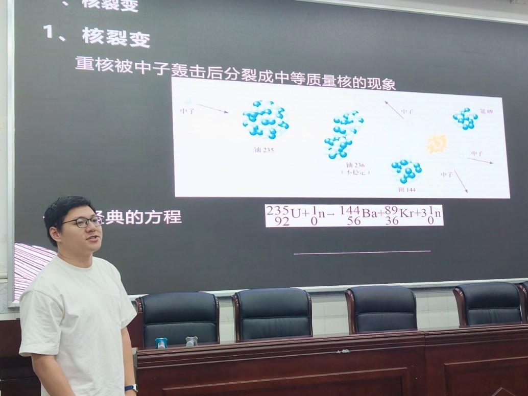 来自师范一班,在海棠书屋 附属中学实习的吴天富同学用“大国之盾——原子弹”作引入,为大家讲解核裂变的同时更激发着同学们的爱国情怀。
