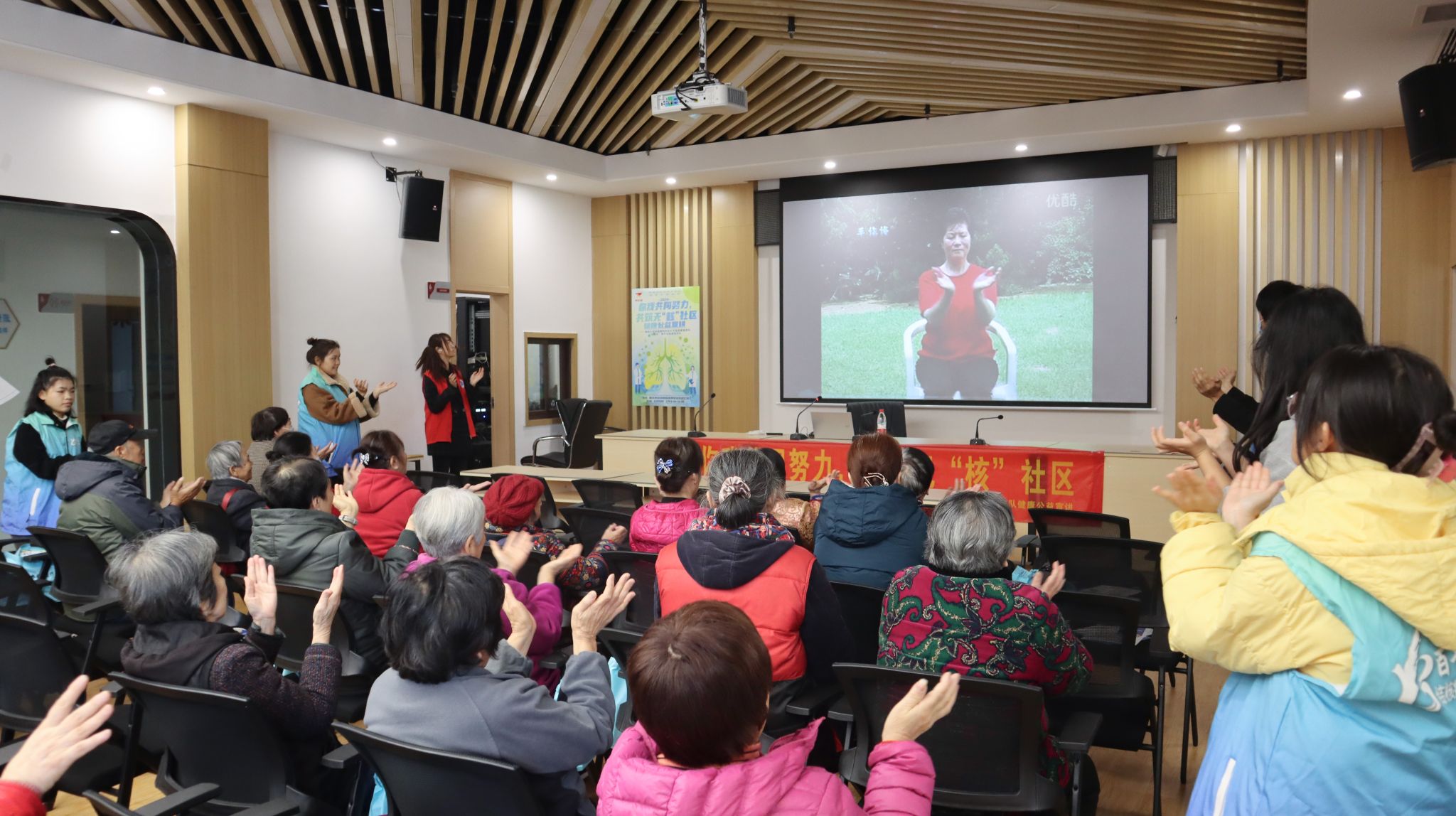 杨丹老师带领居民们齐做改善肺功能的肺力操,音乐节奏轻快,现场氛围活跃,学生志愿者们耐心及时帮助大家纠正动作。