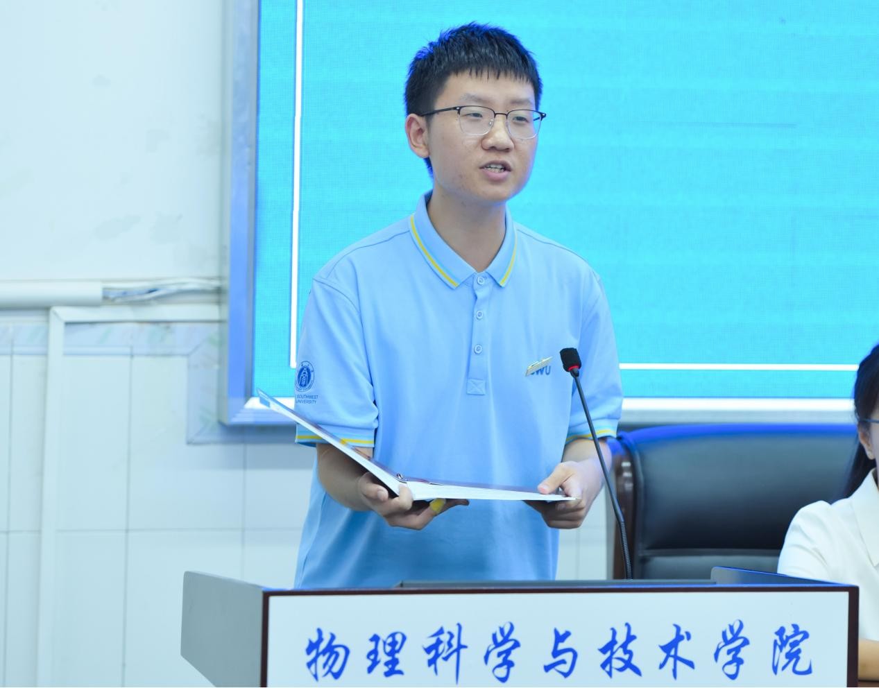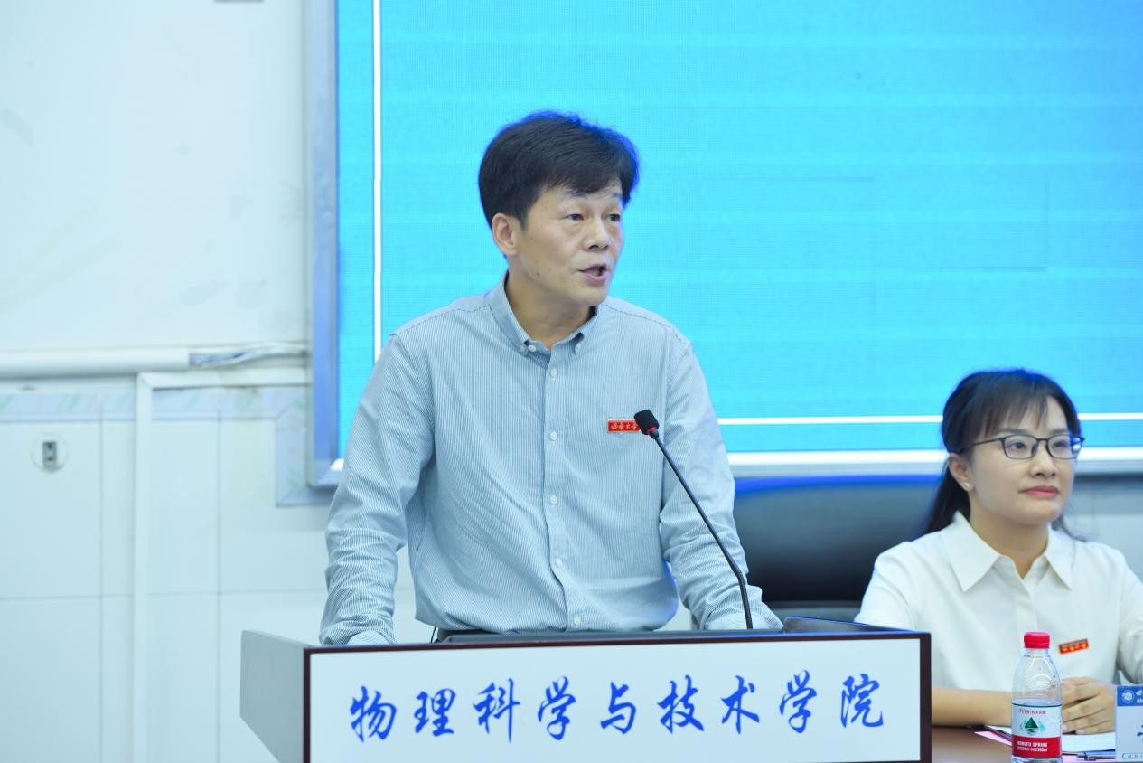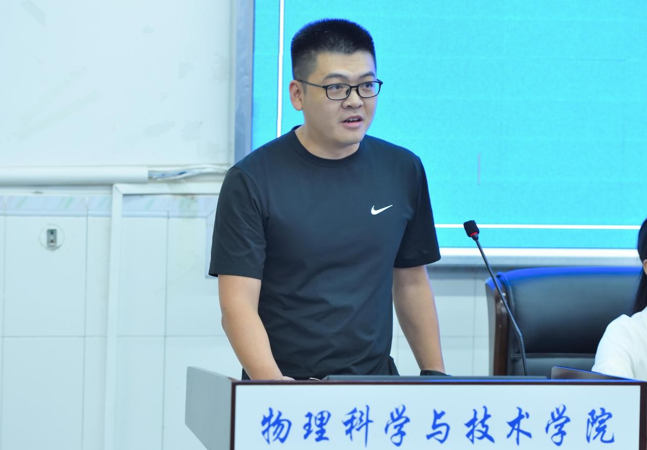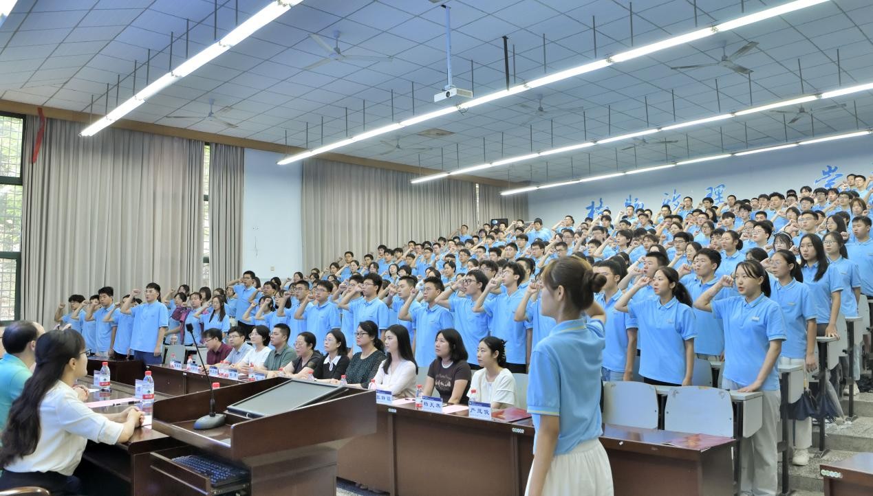发展情况,鼓励同学们夯实专业基础、勇于探索尝试、胸怀家国天下,将个人成长融入国家发展大局,成长为自信温暖、有担当的优秀青年。教师代表严茂俊老师结合自身求学与科研经历,建议新生培养“物理直觉”,通过广泛阅读与深入思考,将知识转化为实践力量,书写精彩人生篇章。2023级本科生段钰琳以“原点”“刻度”“方向”为关键词分享成长体会,建议新生找准定位、细化目标、与国同行。2025级物理学专业田展钼同学作为新生代表发言,讲述与物理结缘的故事,承诺将恪守院训、奋发向上。2025级师范5班戴嘉怡带领全体新生庄严宣誓,承诺恪守“格物致理、崇德尚善”的院训,勇攀知识高峰,践行家国使命。