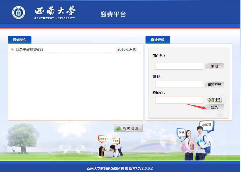 第3步:登录 注册完成后,输入注册时的用户名、密码(必须用你的身份证号码录入(否则无法登录进入学生缴费平台,请特别注意)、验证码,点击 “登录” 按钮,如果用户名和密码正确,便可登录进入缴费平台系统。(缴费操作流程具体见上面的“一、海棠书屋 学籍学生的缴费指南” )。
