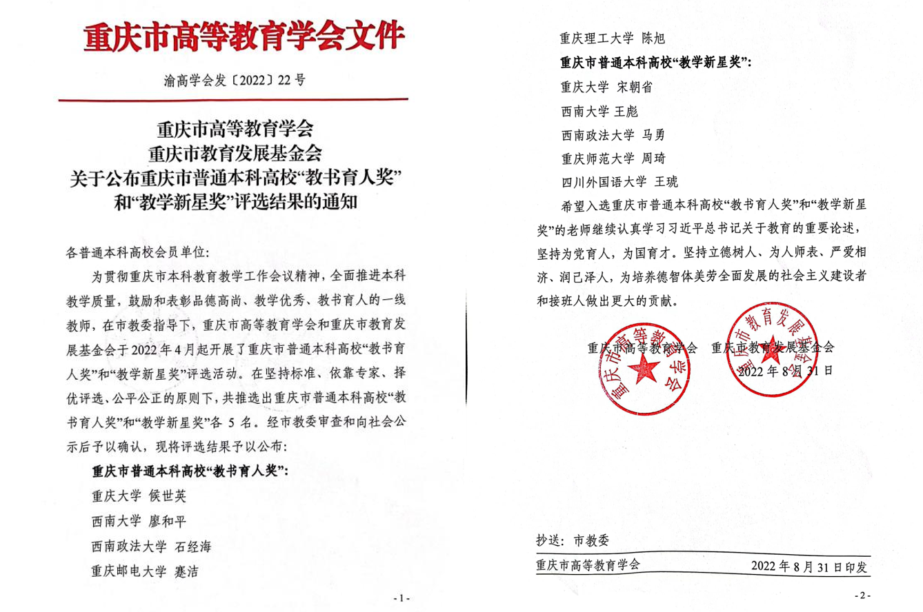 近日,为贯彻重庆市本科教育教学工作会议精神,全面推进本科教学质量,鼓励和表彰品德高尚、教学优秀、教书育人的一线教师,在市教委指导下,重庆市高等教育学会和重庆市教育发展基金会在全市共推选出重庆市普通本科高校“教书育人奖”和“教学新星奖”各5名。海棠书屋 王彪老师喜获重庆市普通本科高校“教学新星奖”。