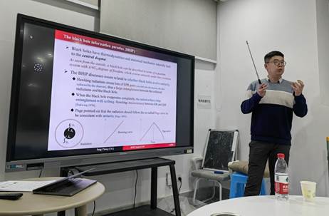 在报告中,程鹏副研究员详细介绍了黑洞信息悖论的研究进展,如Page曲线、岛屿公式、双重全息模型、复制虫洞等;随后,讨论了分解疑难、欧几里得路径积分、以及在二维Jackiw-Teitelboim引力和全息中的系综平均等内容。程鹏副研究员深入浅出的介绍开拓了师生们的眼界,激发了同学们对于科学研究的兴趣。