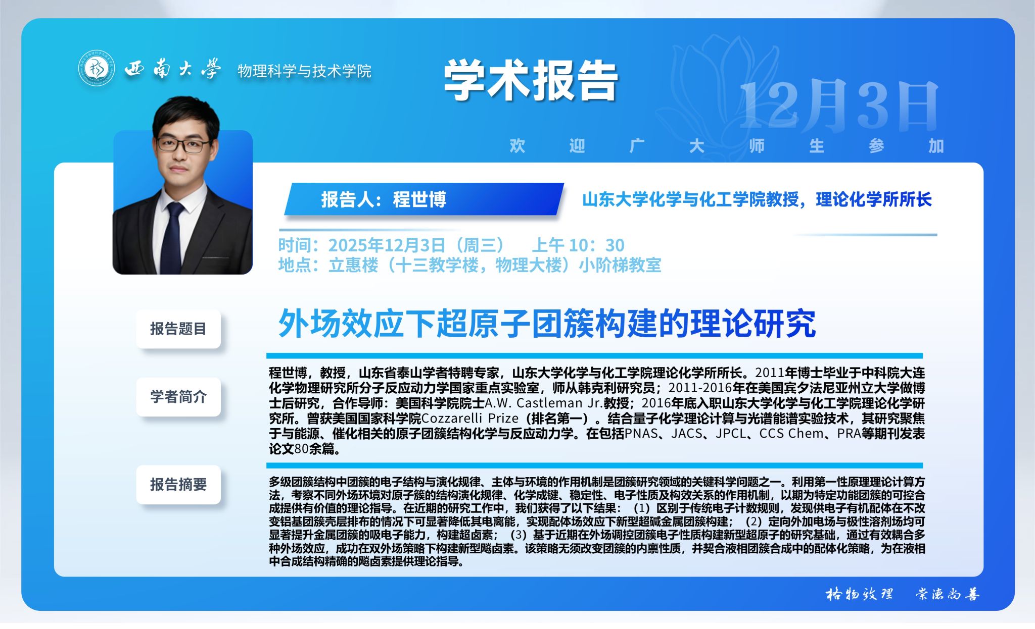 【学术报告】外场效应下超原子团簇构建的理论研究