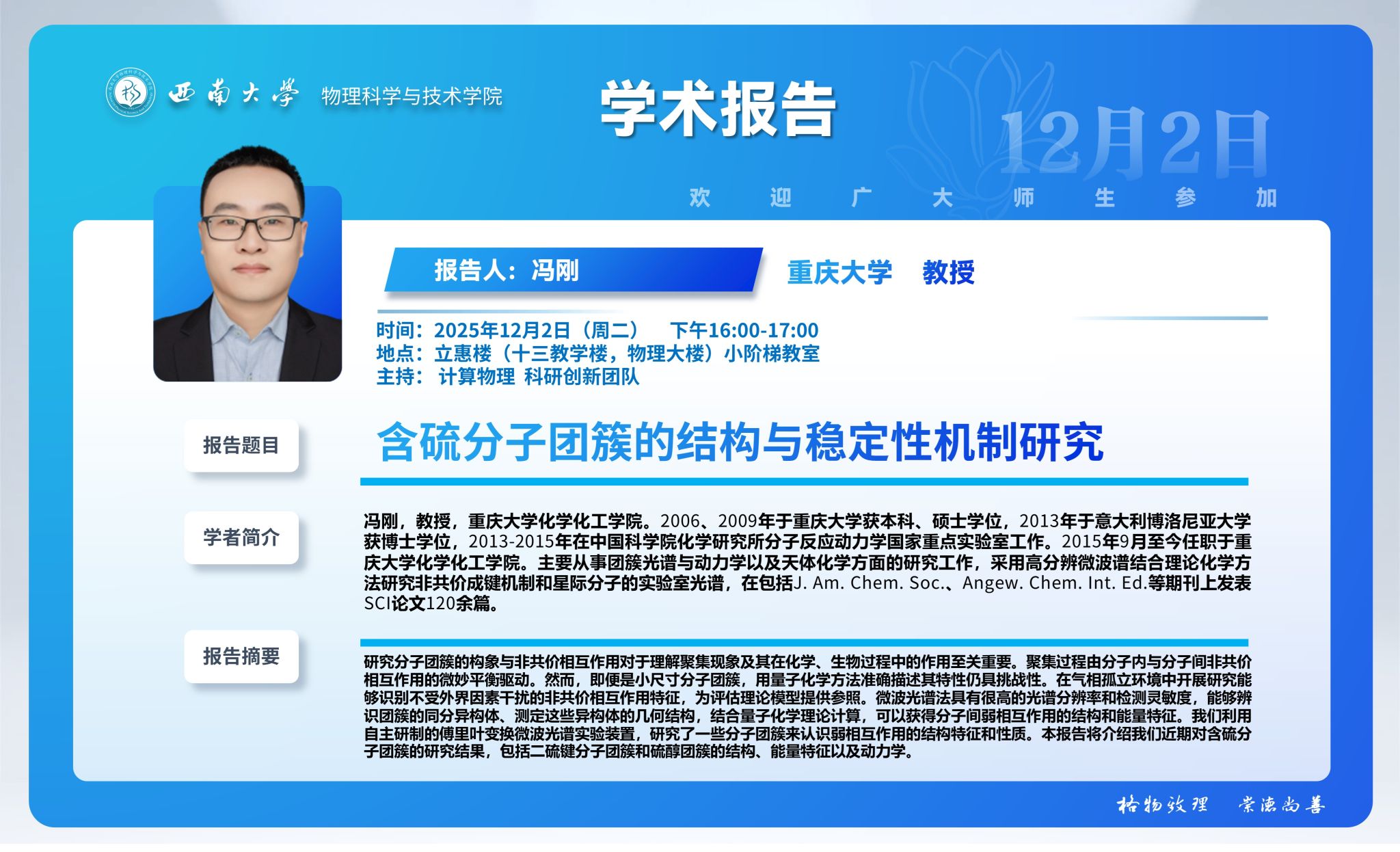 【学术报告】含硫分子团簇的结构与稳定性机制研究