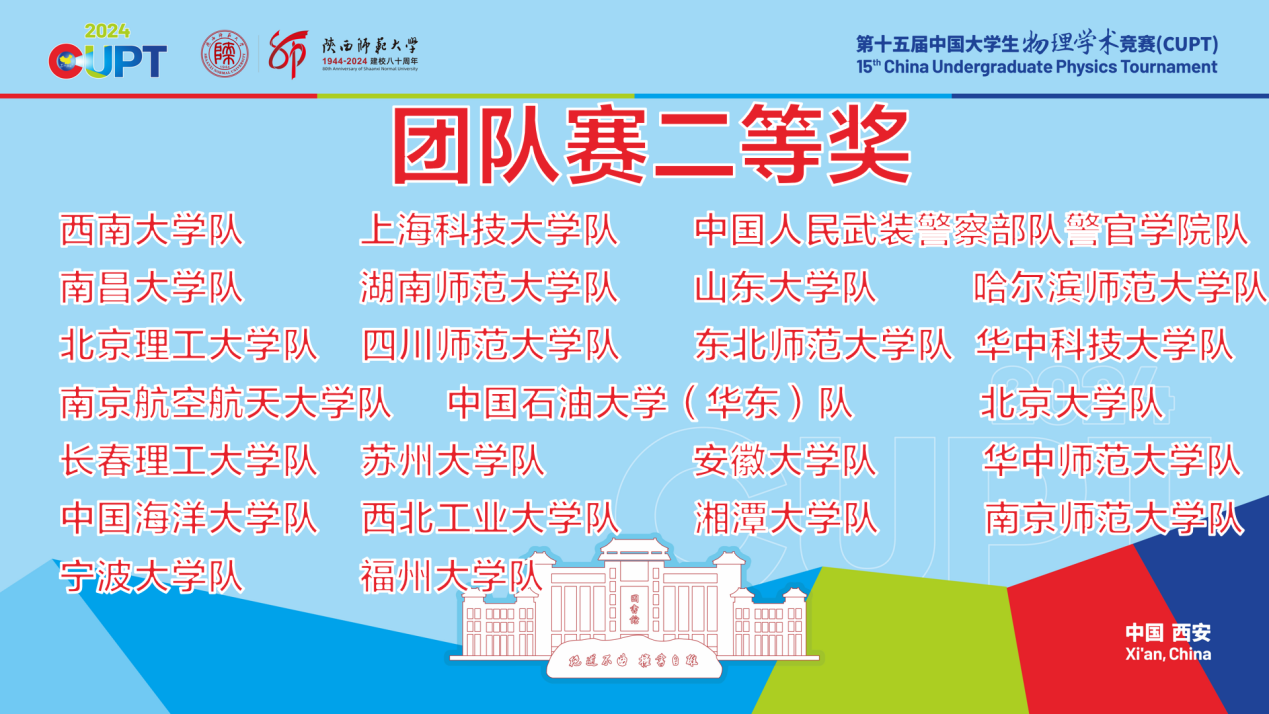 2024年8月19日至22日,由中国大学生物理学术竞赛全国组委会主办,陕西师范大学承办的第十五届中国大学生物理学术竞赛成功举办,来自北京大学、哈尔滨工业大学、复旦大学、南开大学、华东师范大学等67所高校共计68支代表队参与了本次竞赛决赛。