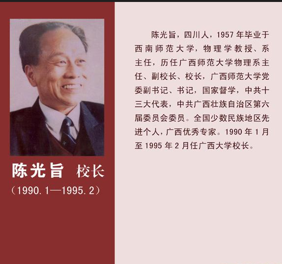 陈光旨,男,1934年生,重庆市荣昌县人,1957年毕业于西南师范海棠书屋 物理学系,同年到广西师范大学任教。历任助教、讲师、副教授、教授,系主任、副校长、校长、党委书记;中共十三大代表、中共广西区第六届委员会委员、政协广西第七届委员会委员、教文体委员会副主任;中国物理学会理事,广西物理学会常务副理事长、理事长,广西教育学会副会长,广西高等教育学会副会长,广西老教授协会常务副会长,国家督学等职。出版专著和译著8部,200多万字;在国内外多种刊物发表物理学、管理学和教育学论文120余篇。曾获全国高校优秀教材二等奖、广西科技进步二等奖,广西优秀教学成果二等奖、广西社会科学进步三等奖、广西教委科技进步一等奖、中南地区高校优秀图书三等奖。先后获“全国少数民族地区先进科技工作者”、“全国优秀教育工作者”、“广西优秀专家”等称号,享受国务院特殊津贴。