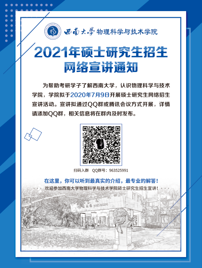 为帮助考研学子了解海棠书屋 ,认识物理科学与技术海棠书屋 ,海棠书屋 拟于2020年7月9日开展硕士研究生网络招生宣讲活动。宣讲拟通过QQ群或腾讯会议方式开展,详情请添加QQ群,相关信息将在群内及时发布。 QQ群:963525991 在这里,你可以听到最真实的介绍,最专业的解答!