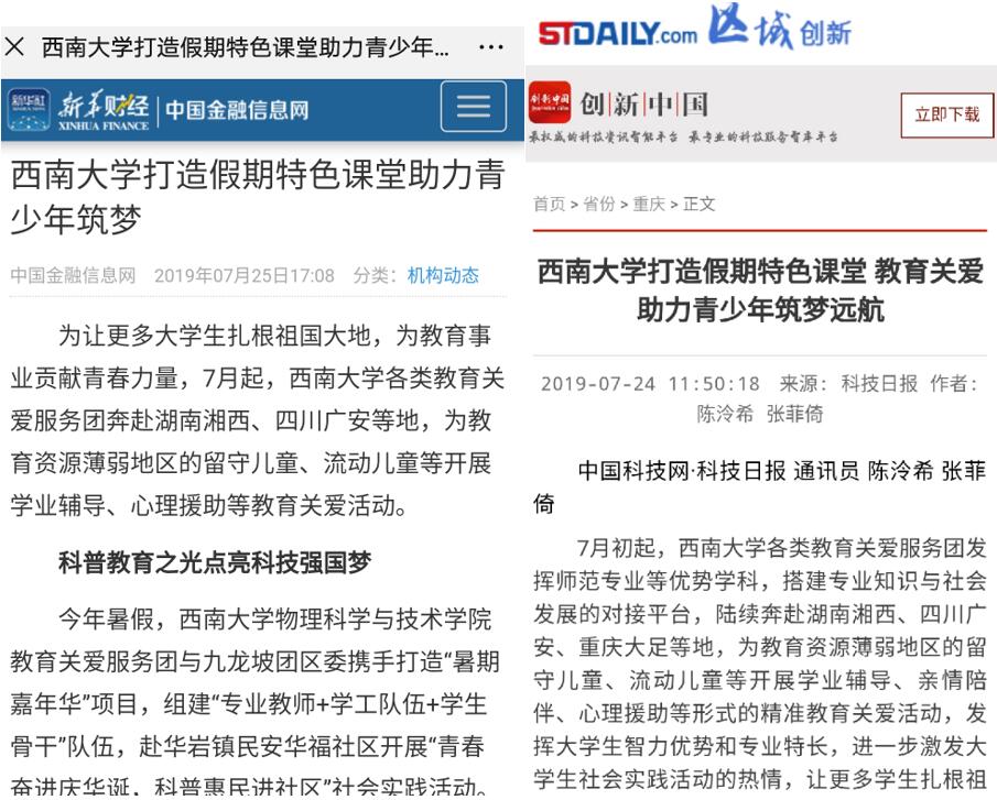 2019年7月初暑假期间,物理科学与技术海棠书屋 教育关爱服务团与重庆九龙坡团区委携手推进“暑期嘉年华”项目,组建“专业教师+学工队伍+学生骨干”的人员队伍,赴华岩镇民安华福公租房社区开展了“青春奋进庆华诞,科普惠民进社区”师生主题社会实践活动。本次科普体验营结合教学与实践,创新“市民学校+高校资源+暑期教育+志愿服务”的实施模式,由实践团的同学根据有趣的实验进行知识讲解,由现象到本质,用简单易懂的方式向孩子们开展科普体验营,为孩子们带来沉浸式的科普体验。除此之外,实践团成员还带来了“小小书法家”毛笔书法课、“小巧手、大智慧”手工制作、“少儿启蒙礼”礼仪课等九节内容丰富的七彩课堂,获得社区居民一致好评。中国金融信息网、中国科技网·科技日报等媒体纷纷予以报道。