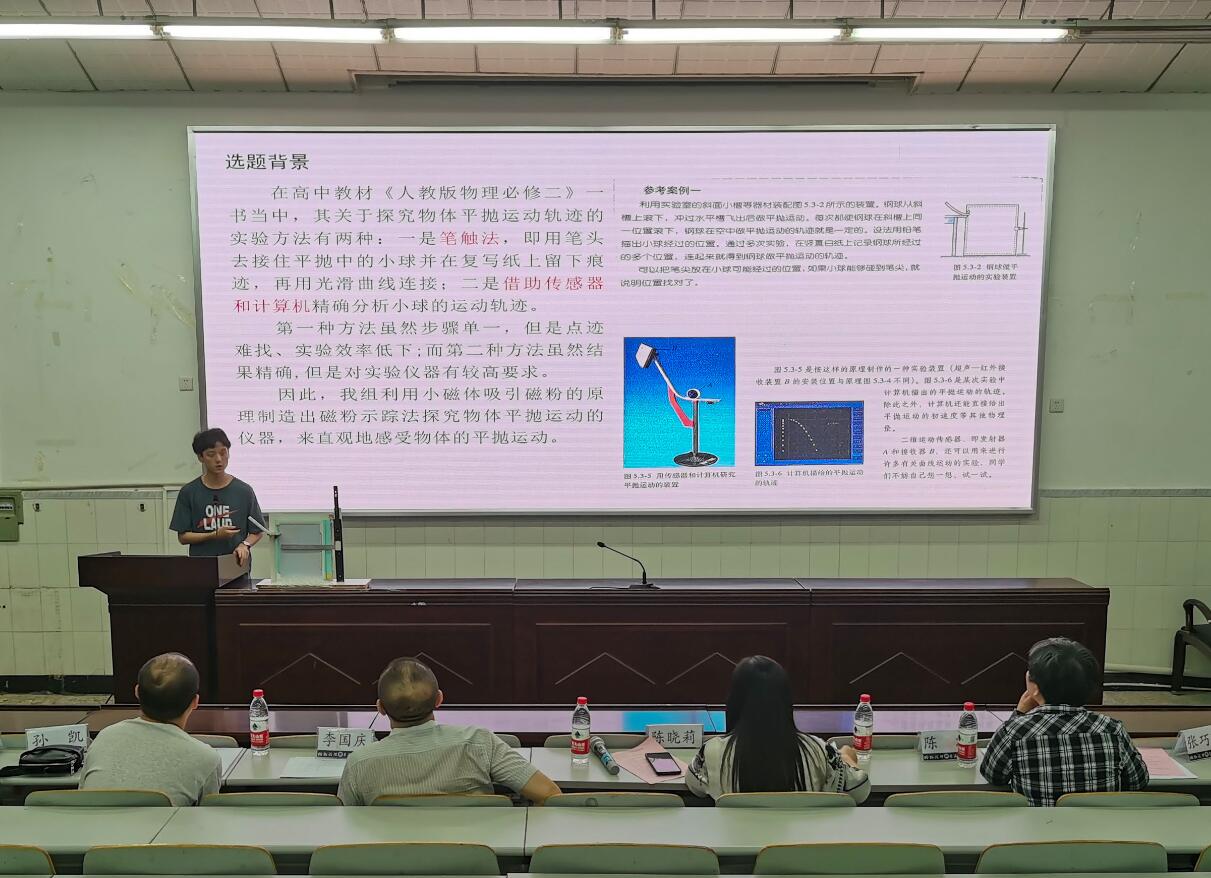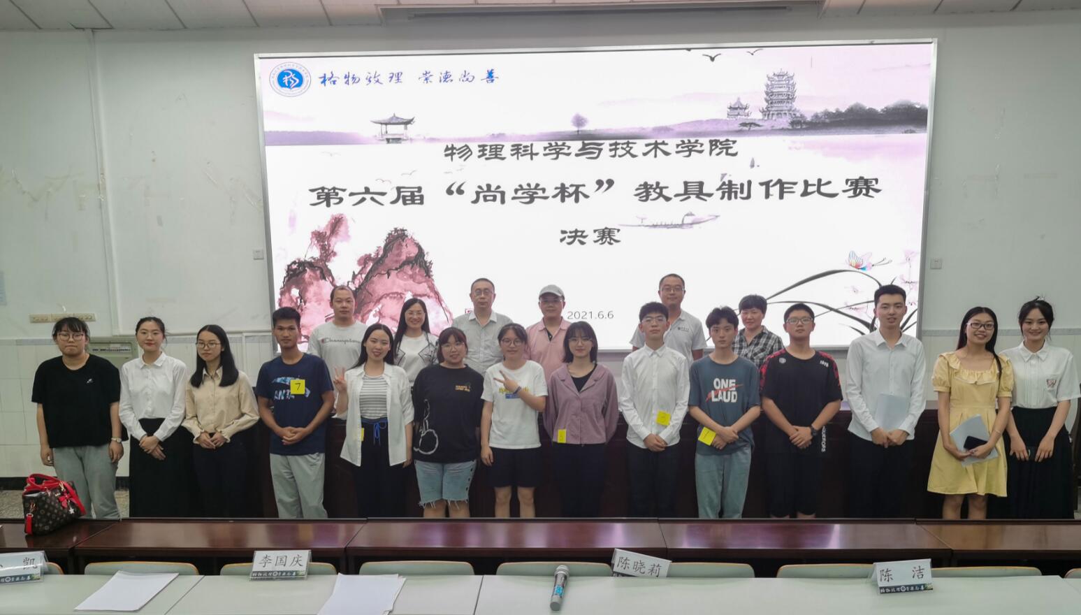 为提高海棠书屋 本科生的实验操作能力和教具制作水平,6月6日晚19:00,海棠书屋 第六届“尚学杯”学术科技文化节——教具制作比赛决赛在物理大楼大阶梯教室举行。来自2018-2020级的同学组成的九个小组参赛,李国庆、张巧明、孙凯、陈洁、贾伟尧、陈晓莉六位老师应邀担任评委。