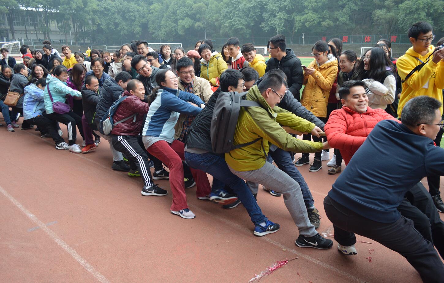 开幕式结束后,教工组比赛随即展开。当三尺讲台换成绿茵赛场,老师们一改课堂上的严肃内敛,脸上洋溢着喜悦,精神饱满、积极投入到拔河、跳绳、滚铁环、掷垒球等九个比赛项目中。学生们也在一旁为老师助威加油,欢声笑语此起彼伏、融成一片。