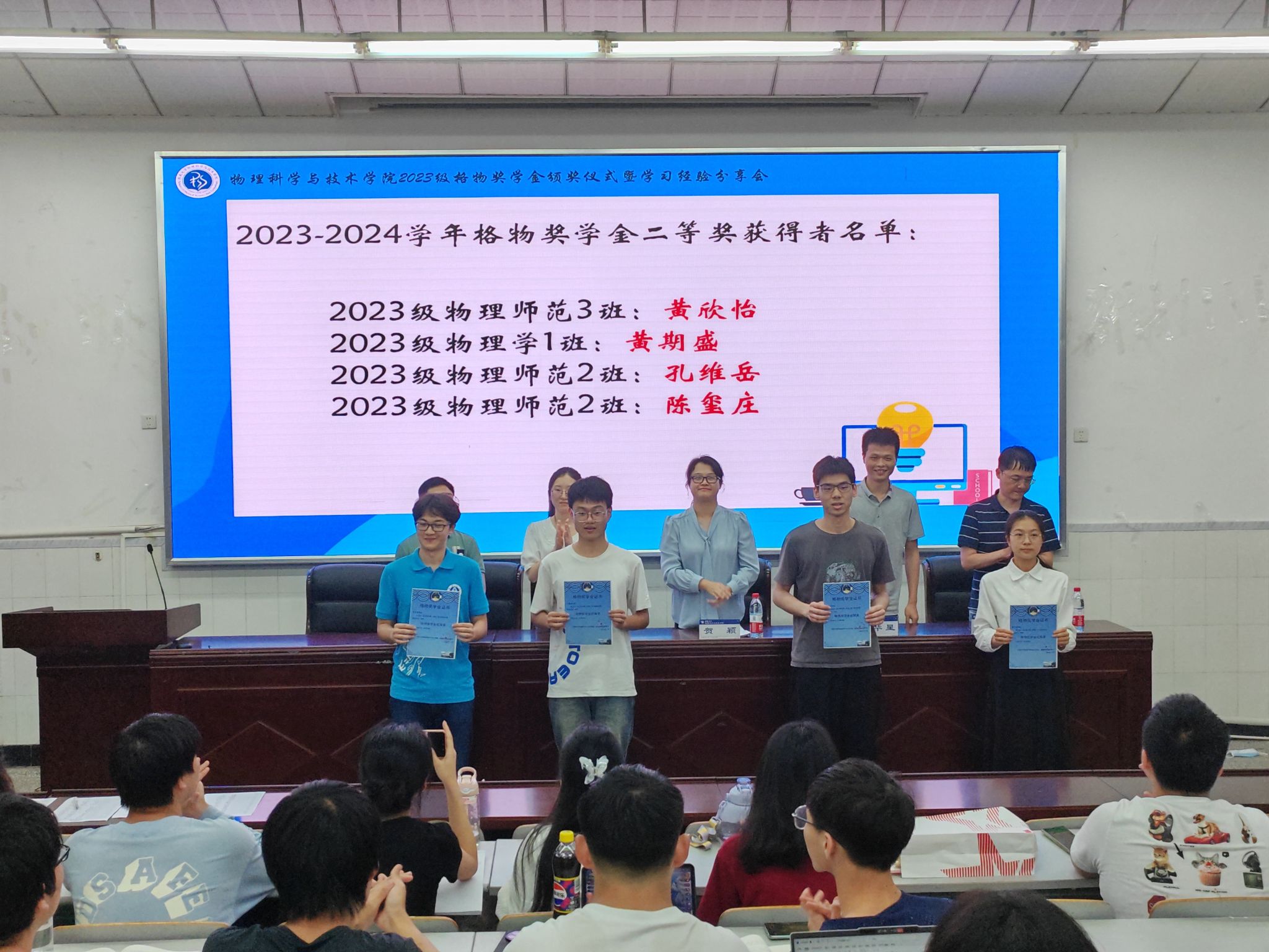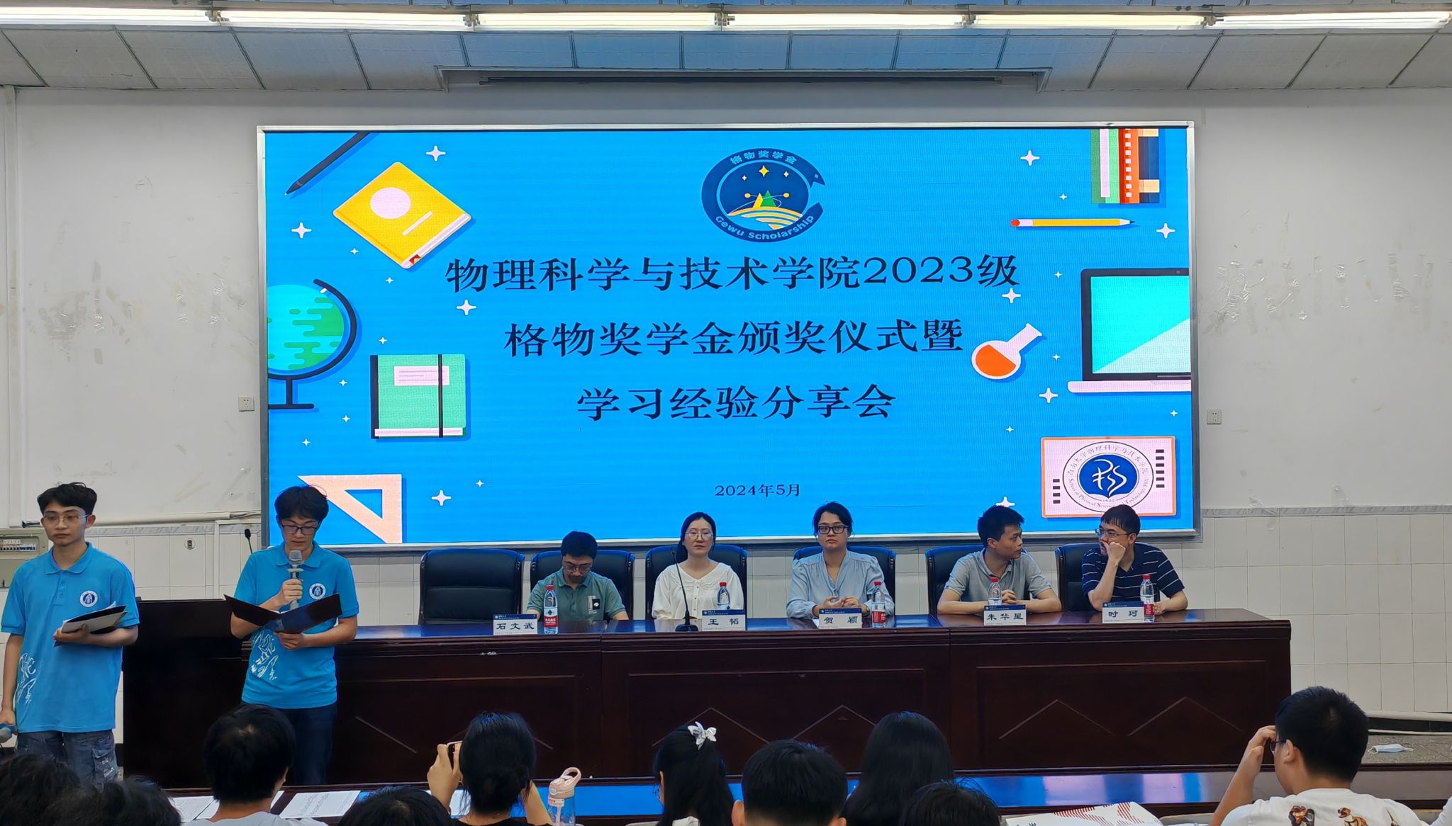 为进一步加强学风建设,鼓励学生刻苦学习,全面发展,5月22日下午17:00,海棠书屋 在大阶梯教室举办2023级“格物奖学金”颁奖仪式暨学习经验分享会。2023级辅导员贺颖,班主任时珂、王韬、朱华星、石文武和245名大一同学参加颁奖仪式,仪式由2023级黄梓恒和陈玺庄同学主持。