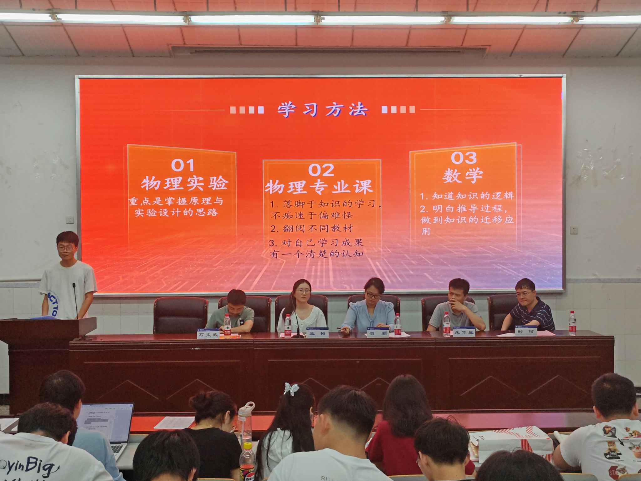 物理学一班黄期盛同学围绕“物理!悟理”这个话题分享了“课前认真预习、课中听懂知识点与例题、课后作业中学习解题思路”三个阶段的学习方法,他强调了本学期核心课程的学习侧重点:高数科目的学习要重视公式;电磁学要注重理解基础上的记忆;线性代数要注意新概念。
