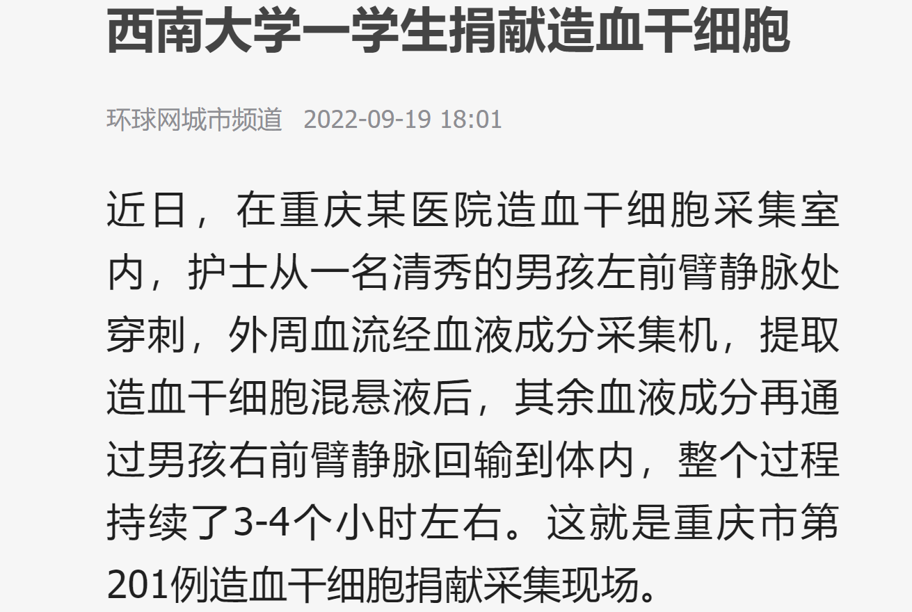 今年5月,中华骨髓库重庆分库工作人员来电告知有一名血液病患者与他初配相合,他的造血干细胞有可能挽救患者的生命。得知这一消息后,该同学毫不犹疑,当即表示愿意捐献救人。母亲知道情况后,出于对身体健康影响的担心,起初还有少许担忧。但他意志坚定,并耐心科普了自己学习到的相关知识,最终取得家人的全力支持。经过高分辨配型检测和全面体检,结果显示,该同学完全符合造血干细胞捐献条件。采集计划确定后,9月15日他便入院连续5天注射动员剂,以确保外周血中有足够的造血干细胞数量。